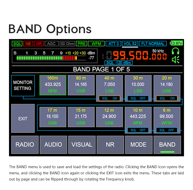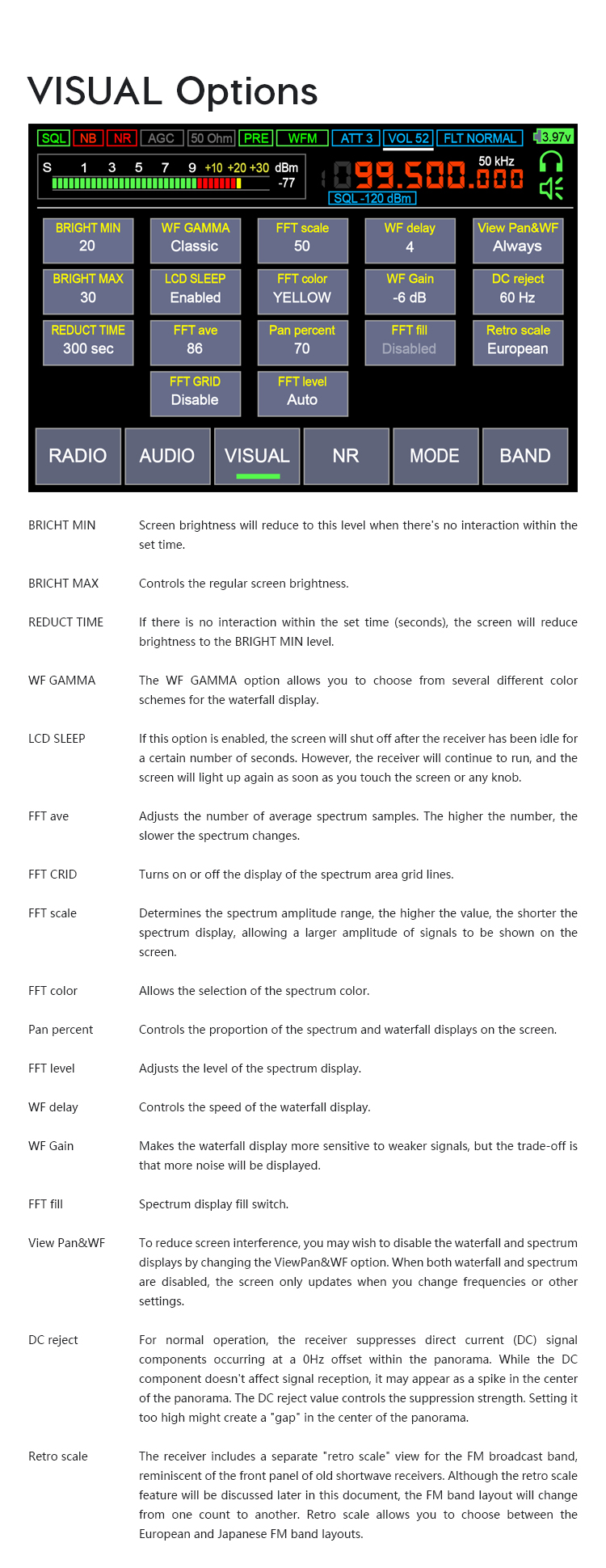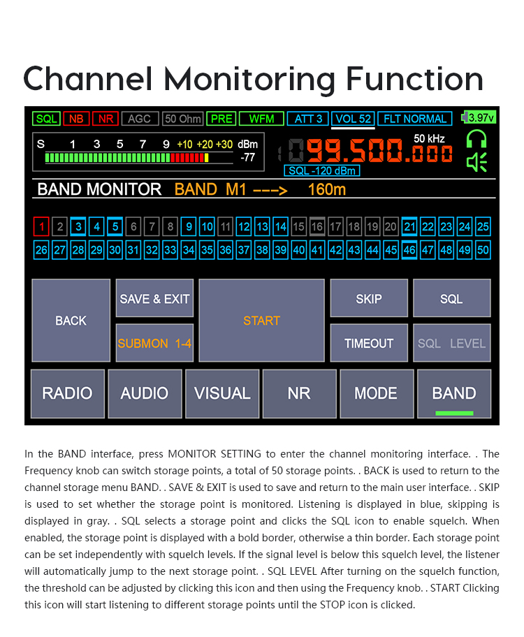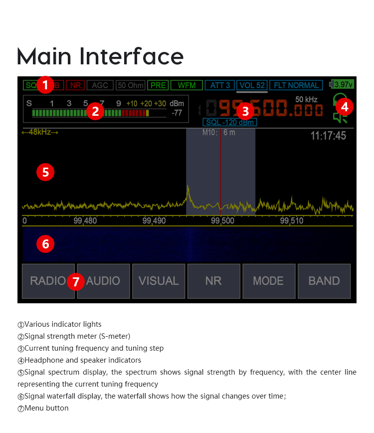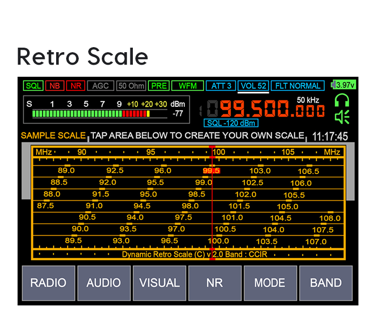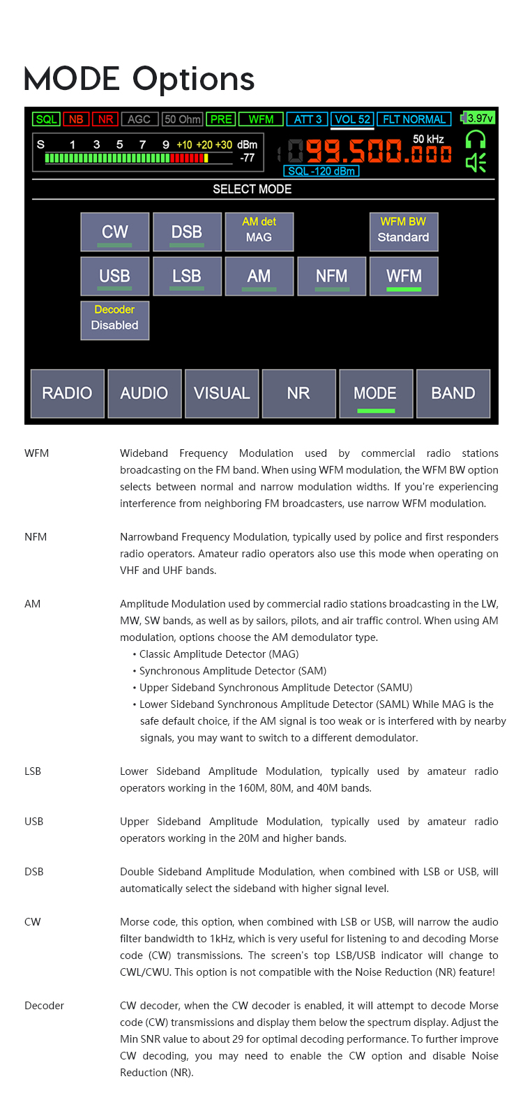 - Modulation type: AM, SSB, DSB, CW, NFM, WFM