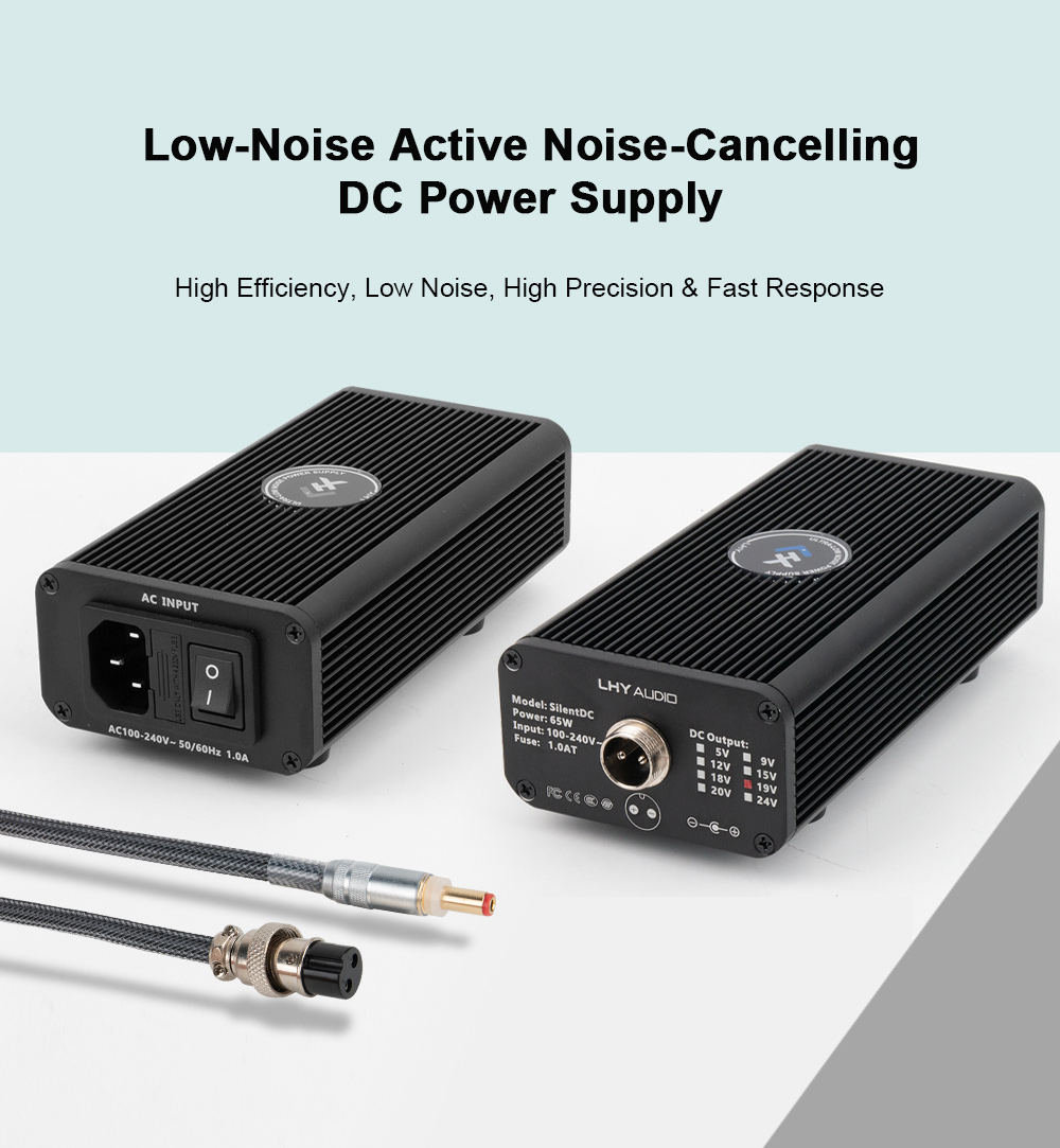 - SilentDC is a cost-effective HiFi audiophile-grade low-noise DC regulated power supply launched by LHY AUDIO. Its DC output ripple can be as low as the microvolt (μV) level, while its size is significantly smaller than that of traditional HiFi linear DC power supplies. Inside, SilentDC adopts a high-performance switching power module, combined with a multi-stage LC filter matrix and active noise-cancellation circuitry. This design effectively suppresses voltage spikes and high-frequency oscillations, improving both power supply safety and audio purity. It also significantly reduces EMI (Electromagnetic Interference) and RFI (Radio Frequency Interference) noise at the input source, delivering a cleaner and more stable power environment.