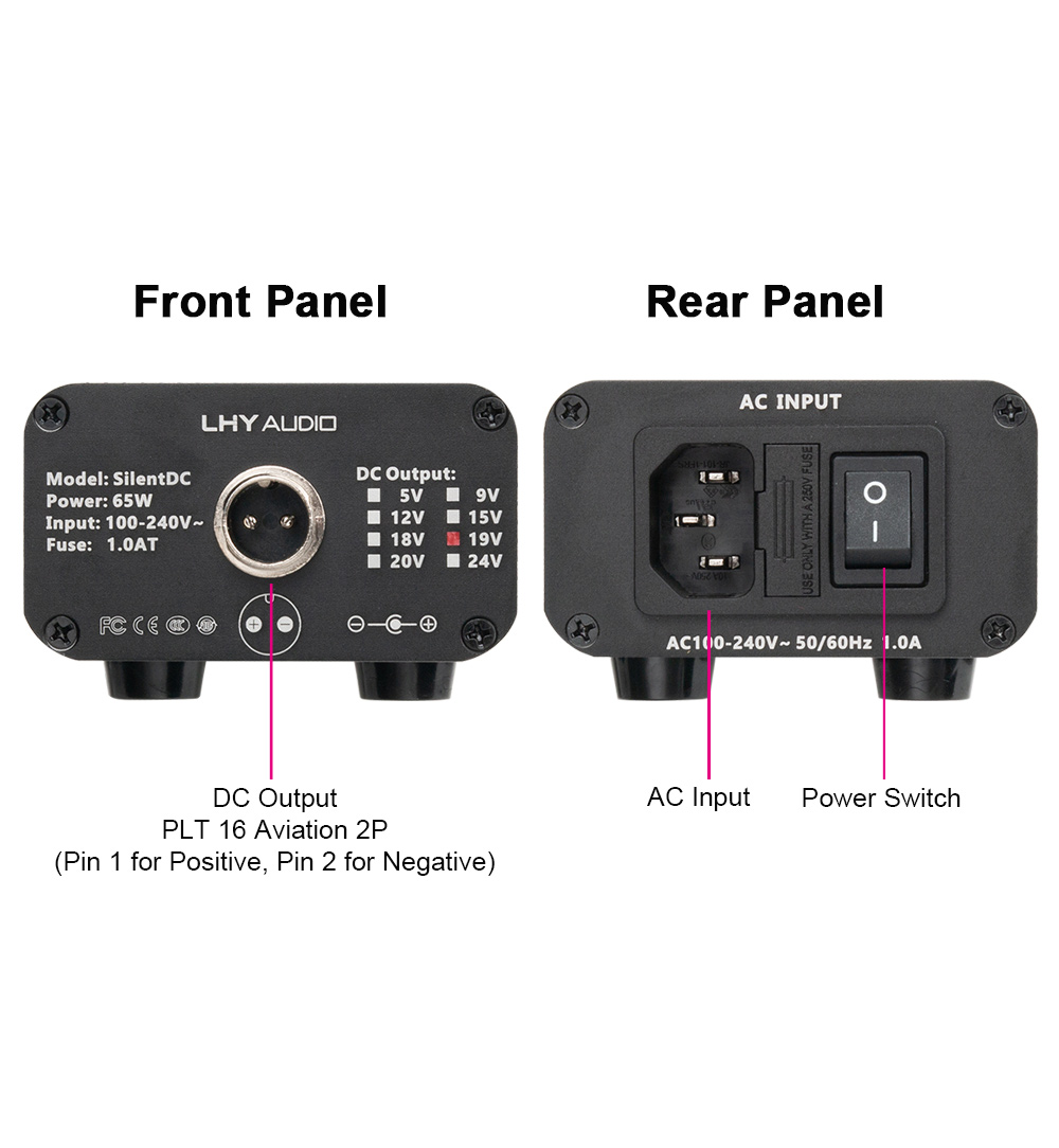 - SilentDC offers multiple output voltage options, making it compatible with a wide range of high-end HiFi audio equipment. Users can choose based on their device's input voltage, connector size, and polarity to ensure proper compatibility and enjoy an almost noiseless, high-purity power supply solution.