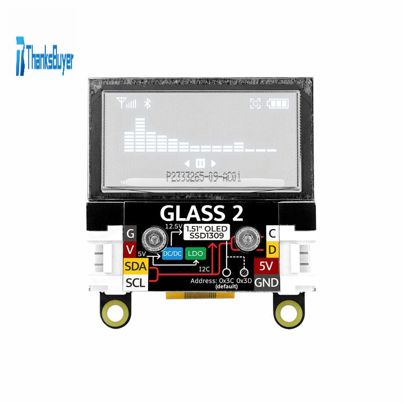 - Glass2 Unit is a 1.51-inch transparent OLED display unit that adopts the SSD1309 driver solution. It supports the I2C communication interface (default address 0x3C) and has a built-in solder pad that allows changing the communication address to 0x3D. It is suitable for home products and control devices, and can be used for information display, status indicators, or user interfaces, embedded into various home products or control devices to achieve interaction with users.