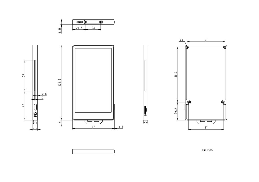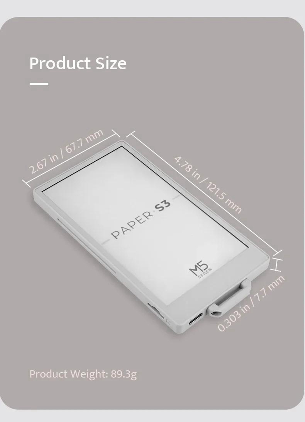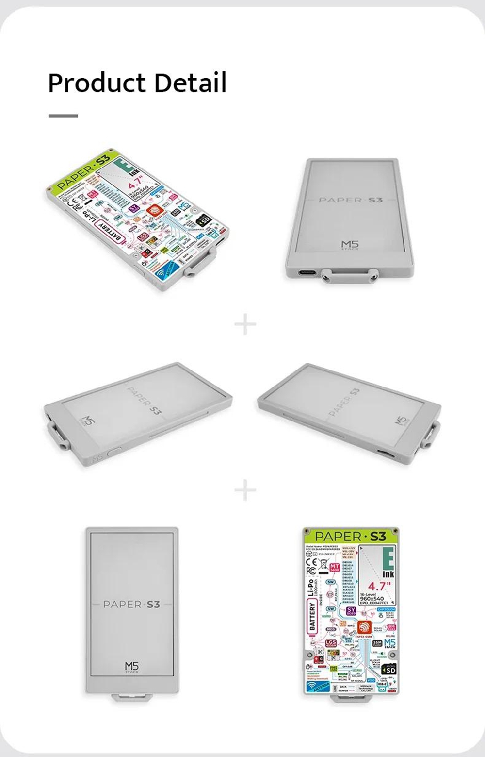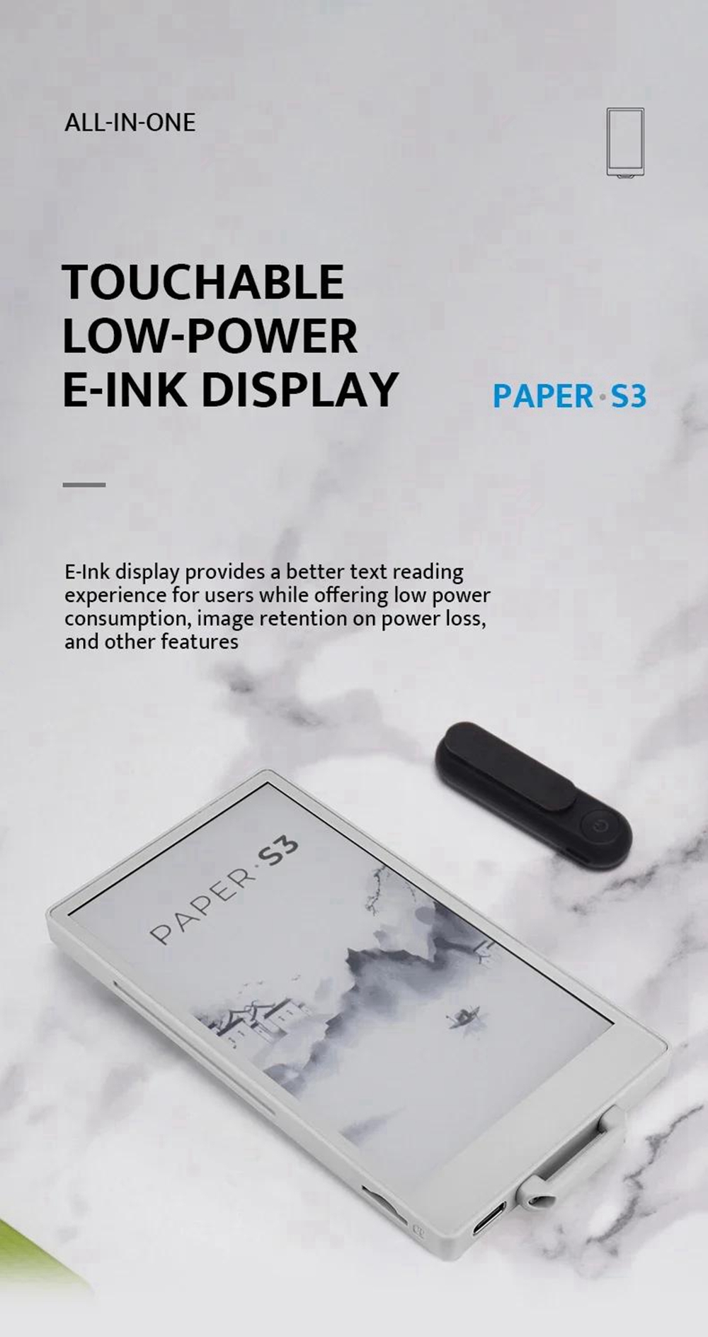 - PaperS3 is a touch-enabled, low-power e-ink display main control device launched by M5Stack, powered by the ESP32-S3 controller. The front features a 540×960 @ 4.7" (integrated touch and screen) e-ink display that supports 16-level grayscale. Equipped with a GT911 capacitive touch panel, it supports two-point touch and various gesture operations. Compared to previous products, PaperS3 adopts a full-screen structure. Unlike ordinary LCD screens, the e-ink display provides a better text reading experience while offering low power consumption and image retention when powered off. The device is also designed with a convenient ear hook, making it easy to carry and hang, enhancing practicality and portability.
