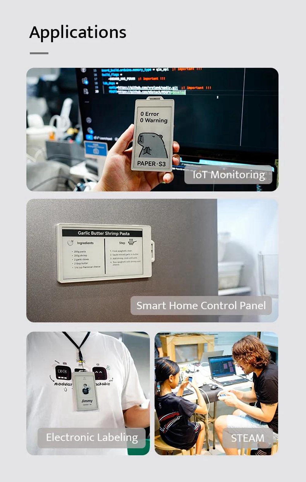 - PaperS3 is suitable for applications such as IoT monitoring, smart home, environmental monitoring, health monitoring, electronic labeling, data recording, and various low-power display and interaction scenarios.