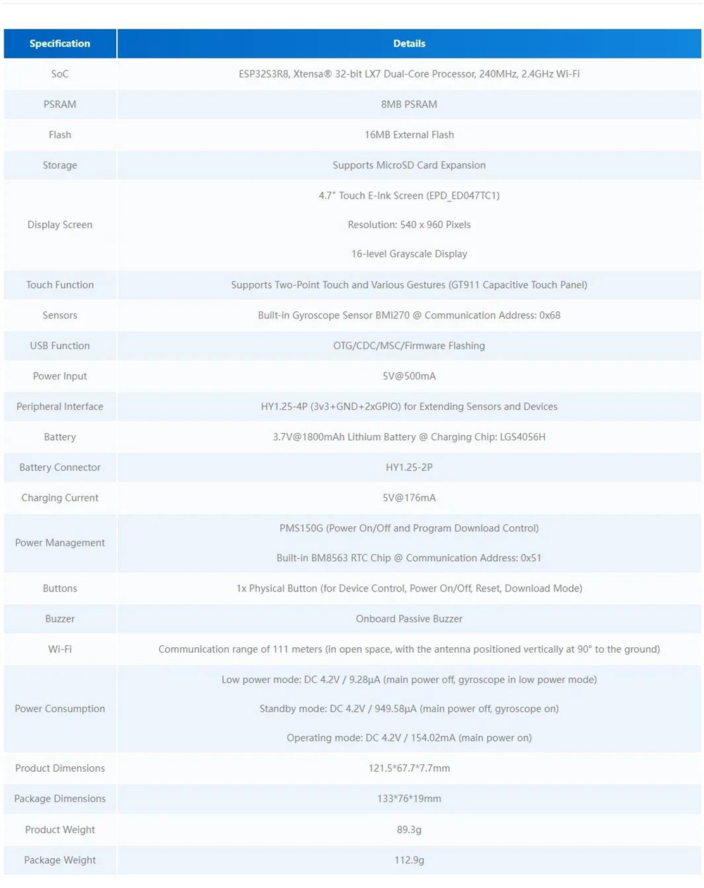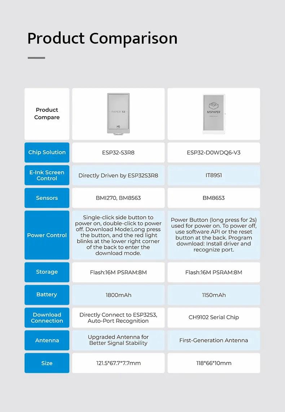 - It integrates a gyroscope sensor, onboard buzzer, and physical buttons, enabling interactive operations such as power on/off. In terms of data storage, PaperS3 is equipped with a MicroSD interface, and the ESP32-S3R8 chip comes with 8MB of PSRAM. Additionally, the device includes an external 16MB flash chip for storage expansion, ensuring higher capacity and faster data access. It features a built-in 1800mAh lithium battery with charging capabilities. Combined with the internal RTC (BM8563), it supports sleep and wake functions, offering robust battery life. The device also includes an onboard battery monitoring circuit for real-time battery status monitoring, ensuring effective battery health management.