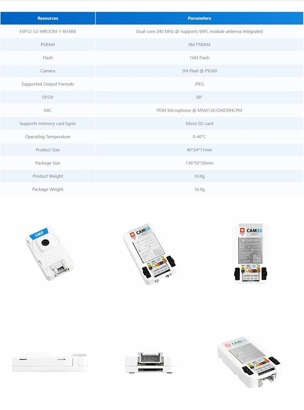 - CAMS3 5MP Unit is a streamlined camera module based on the ESP32S3, supporting WiFi cloud image transmission. It features 8M PSRAM and 16M Flash memory, paired with a custom 5-megapixel camera (PY260) that has a DFOV of 88° and can capture photos at a maximum resolution of 2592x1944. The unit includes a built-in Micro SD card slot for storing images and other data. An integrated PDM microphone allows for sound recording. The HY2.0-4P port at the bottom exposes the S3 internal D+/D- pins, supporting firmware updates or USB serial communication through the M5Grove2USB-C module. Two 1x3 pin headers on the board allow for ESP32S3 program downloading. The factory firmware provides a complete image capture and upload function called EZData, enabling users to achieve remote, free image monitoring through simple configuration. This product is suitable for remote monitoring, time-lapse photography, industrial automation, and various other applications.