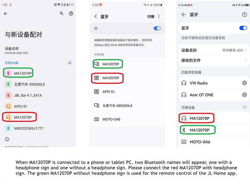 - Turn on Bluetooth on your phone, search for the Bluetooth name: MA12070P and connect.