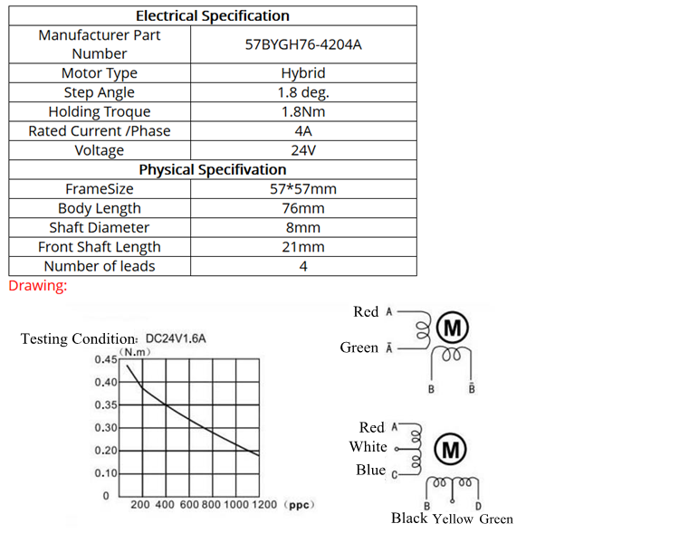 This stepper motor is one of the most popular model, it with step angle 1.8deg and size 57x57x76mm. It has 4 wires with 1m cable and 2.54mm pitch connector, each phase draws current 0.4A at 12V, with holding torque 1.8Nm.  It can be widely used in 3D printer, robotics, Reprap project and CNC machine.