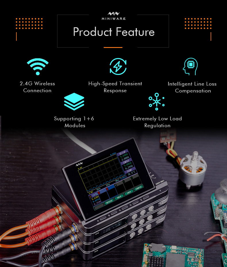 MDP-XP consists of a display control module (MDP-M01) and a digital power supply module (MDP-P905). Through 2.4G wireless connection, it achieves multichannel free combination at the power of 90W per channel. MDP-XP is a high cost-effective programmable linear DC power supply, featuring indicators, stability, reliability and distinct user interface comparable with professional power supplies; it also provides programmable output, timing output, sequential control, automatic compensation and other powerful functions, so as to meet diversified testing needs.