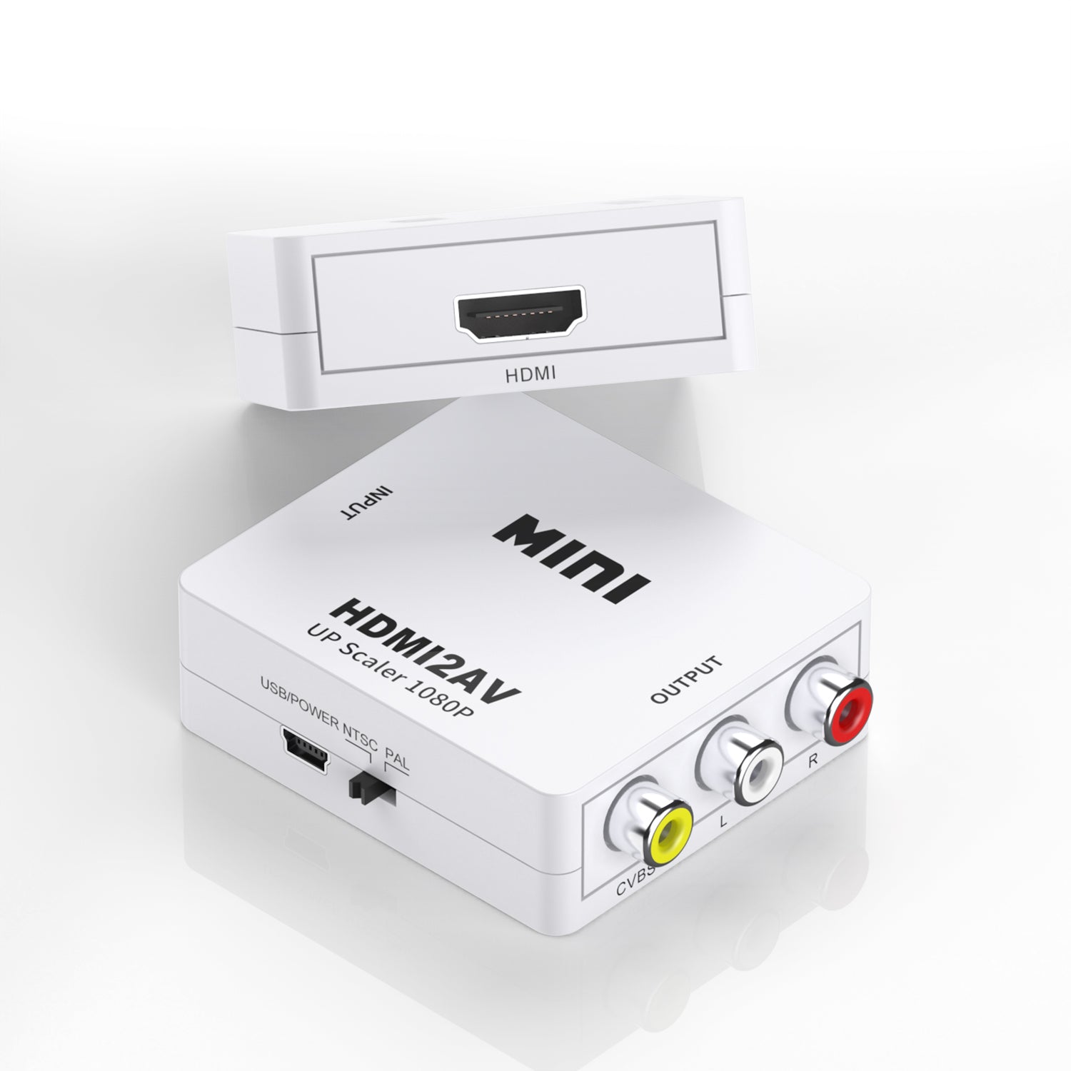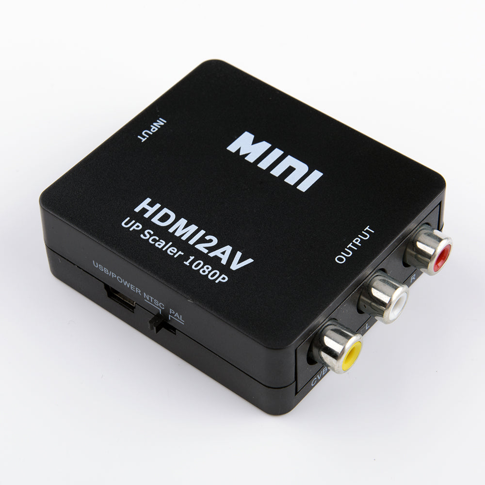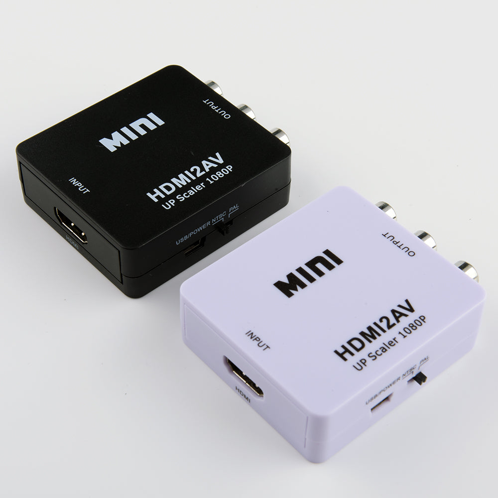 The HDMI terminal of HDMI to AV Adapter receives signals and AV ports release signals. It allows single-direction uses only. It is for devices with HDMI interface, including PC, set top boxes, and game consoles. It can connect to display equipment with AV interfaces, for example, old TVs, monitors, projectors. It is compatible with 1080P and resolution less than 1080P. It support audio and video synchronization, PAL/NTSC switching. Just plug to play.