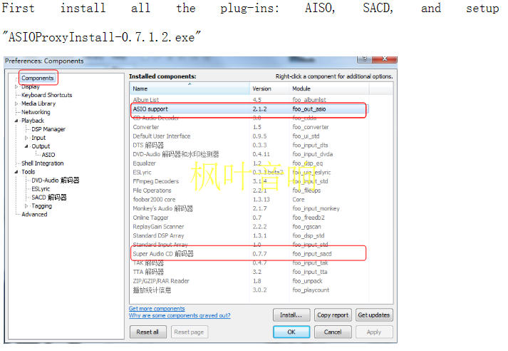 1.First open player "File-Parameter Options", click "Component" on the left, and then click "Install" in the lower right corner to install downloaded plug-in for ASIO: foo_out_asio.fb2k-component (first unzip downloaded plug-in compression package ), press "OK" to restart player for FOOBAR, as shown in the figure below after installation is complete.