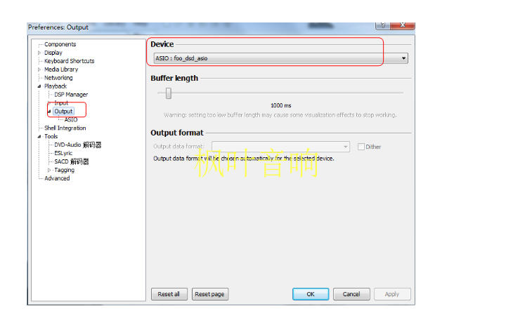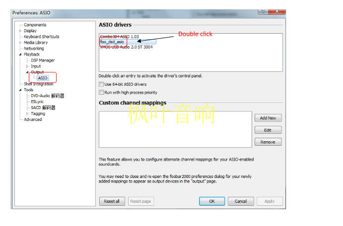 4.Click "ASIO" in "Output" drop-down menu on the left, double-click on the right: foo_dsd_asio, as shown below.