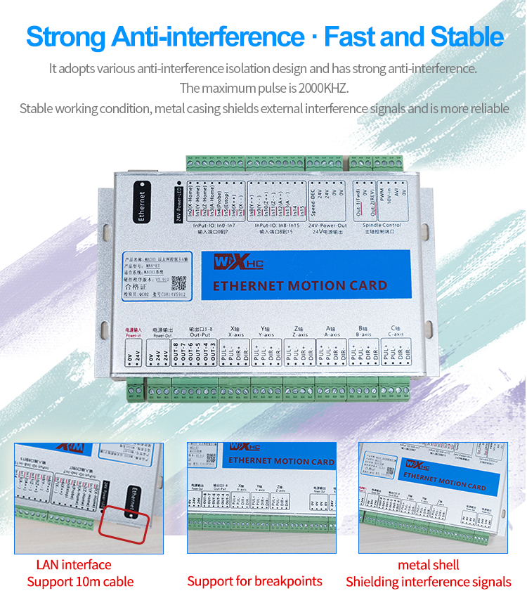- Maximum 2000KHZ pulse output for each axis, supporting stepper motors and servo motors