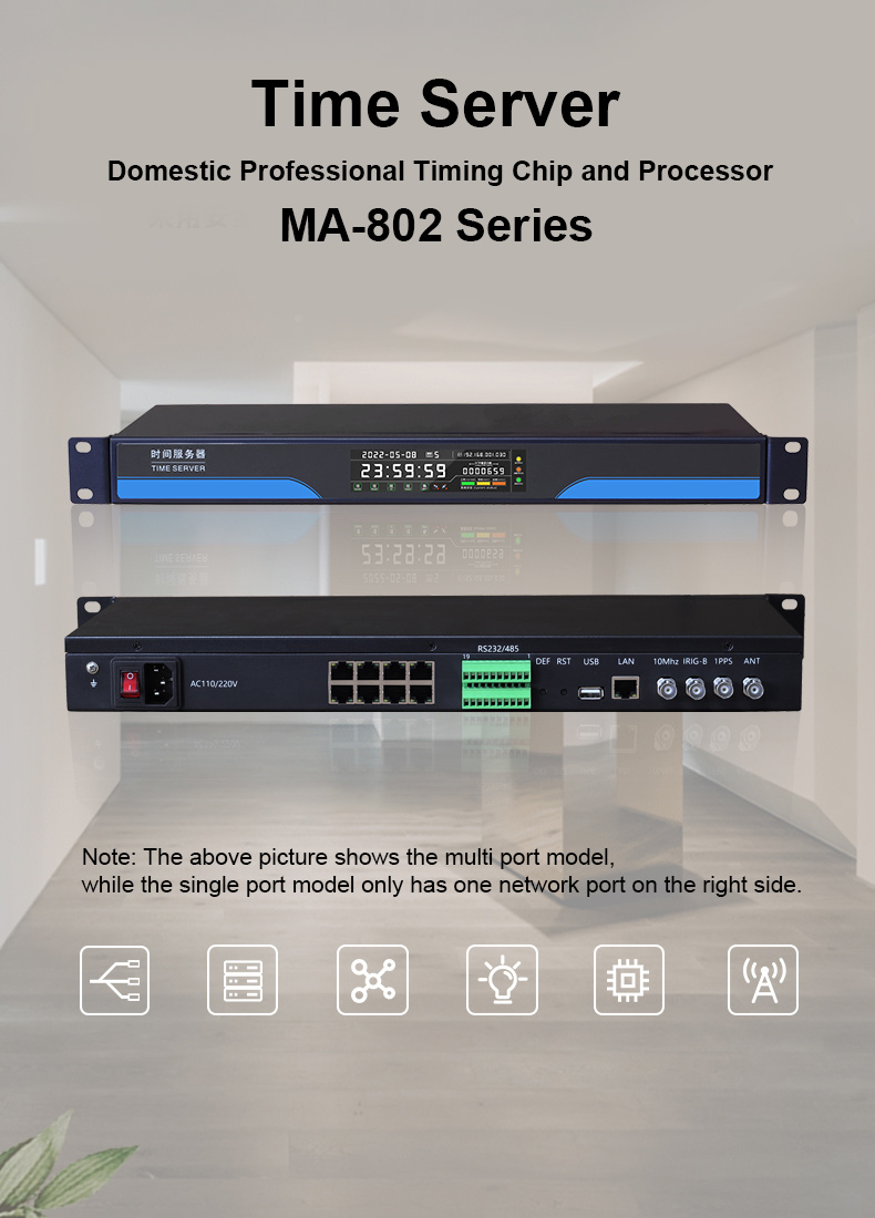 - MA-802 series time server is a high-precision, highly concurrent and multi-functional satellite time synchronization device, which can support multiple time synchronization protocols, including NTP, PTP, IRIG-B code, 1PPS, RS485 and RS232 output. It adopts high-quality professional domestic clock timing chips, ensuring high-precision clock synchronization, supporting up to nine 10/100M adaptive Ethernet ports, and physically isolating each other. NTP synchronization accuracy is better than 1ms. In terms of high concurrency, the time server can process about 30000 times service requests per second, providing efficient time synchronization support for your applications.