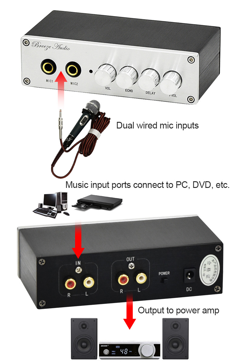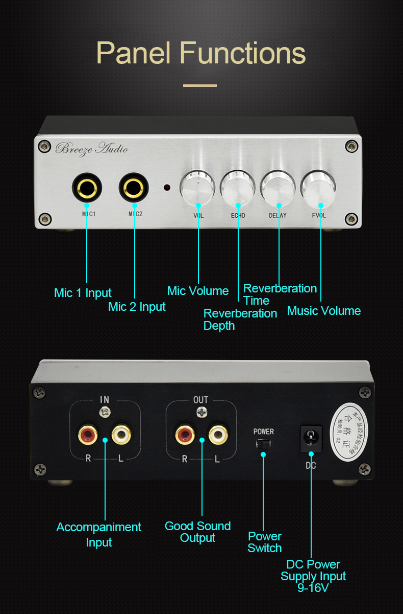 - Powerful configuration: Multiple sound source inputs; professional karaoke decoder chip; gain loudness adjustment; hard solution noise reduction, high fidelity; low power consumption, low heat generation, safety and environmental protection; wide voltage input, plug and play; multi-level reverberation, effect adjustment; low distortion operational amplifier; dual microphone inputs.