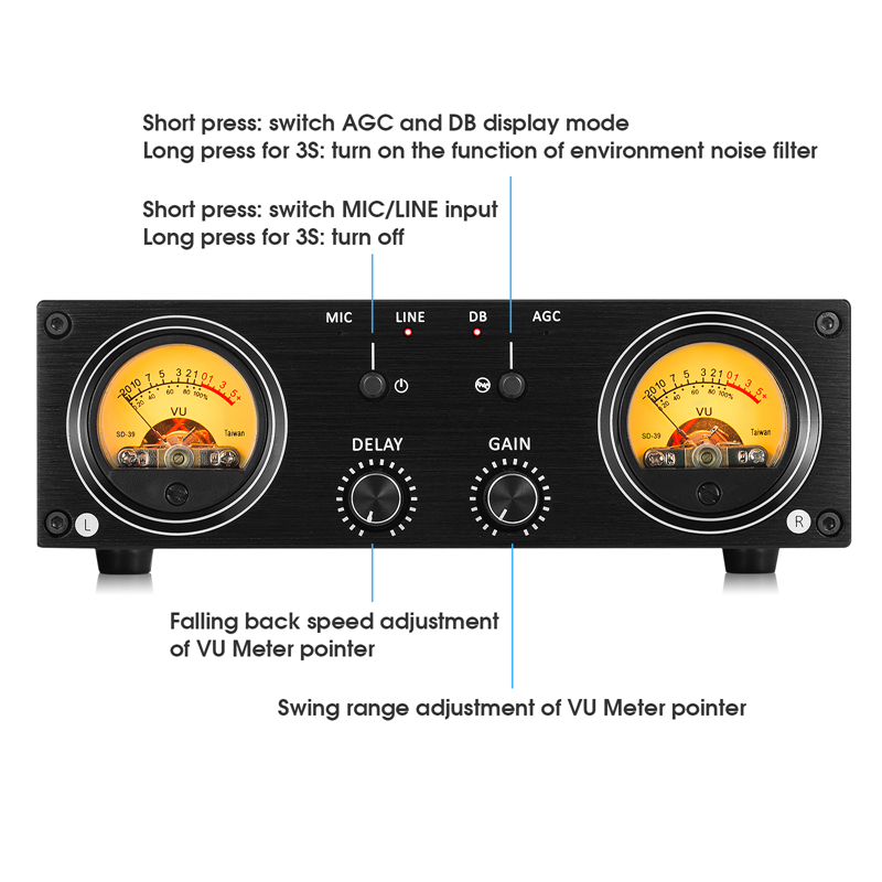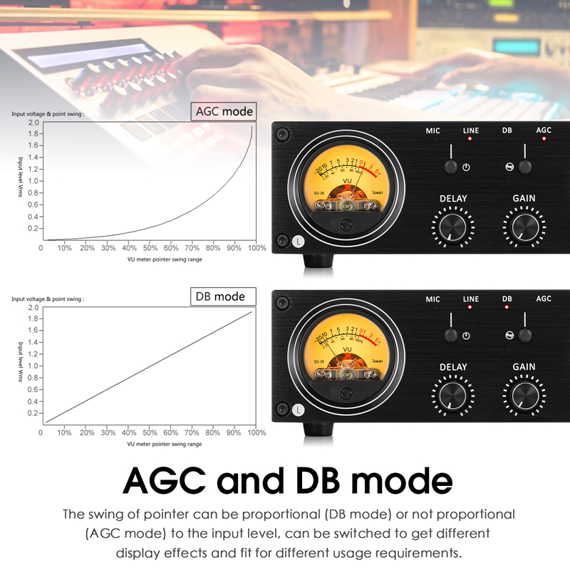 - AGC: The automatic gain mode is actually a compression mode. The function is the same as the professional VU driver board. It is a square root audio compression. When the volume is low, the compression is very small. The larger the volume, the greater the compression. The maximum is 3 times compression ratio. So in this mode, the pointer beating is more suitable for daily use. It is more consistent with human perception.