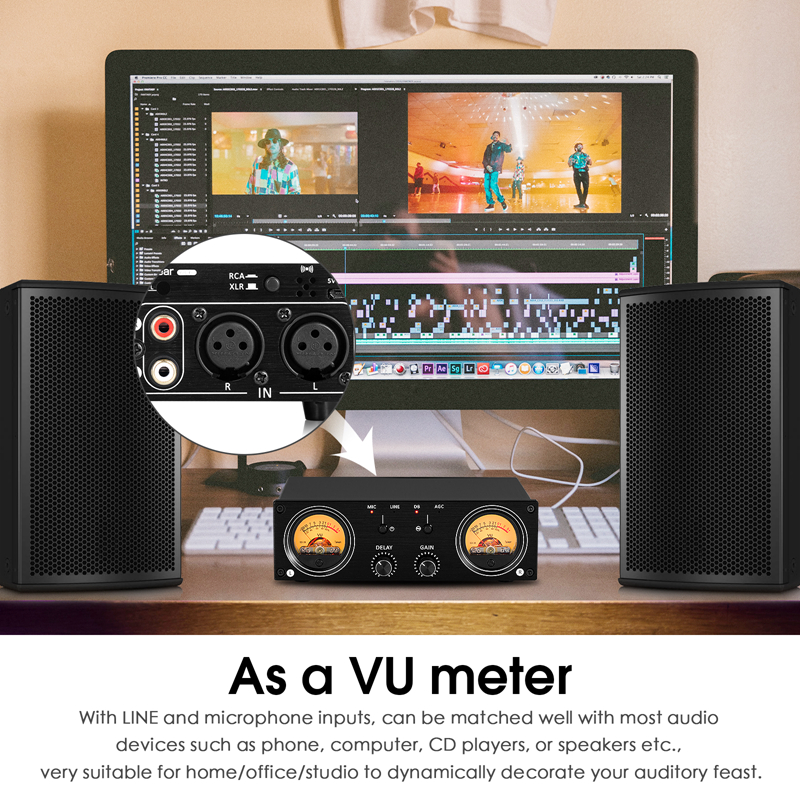 VU1-PRO is a multifunctional device that integrates VU meter and RCA/XLR switcher. While switching audio signals, you can enjoy the visual experience brought by VU meter. It supports two audio signal processing methods, DB and AGC, and provides super wide input signal range up to 5Vrms. At the same time, it supports manual and quick adjustment of pointer swing sensitivity and range, and you can quickly set VU1-PRO to work in the best working state. VU1-PRO also has a built-in microphone pickup, no need to connect an audio cable. You can also enjoy the effect of the VU meter beating with the rhythm of the music.