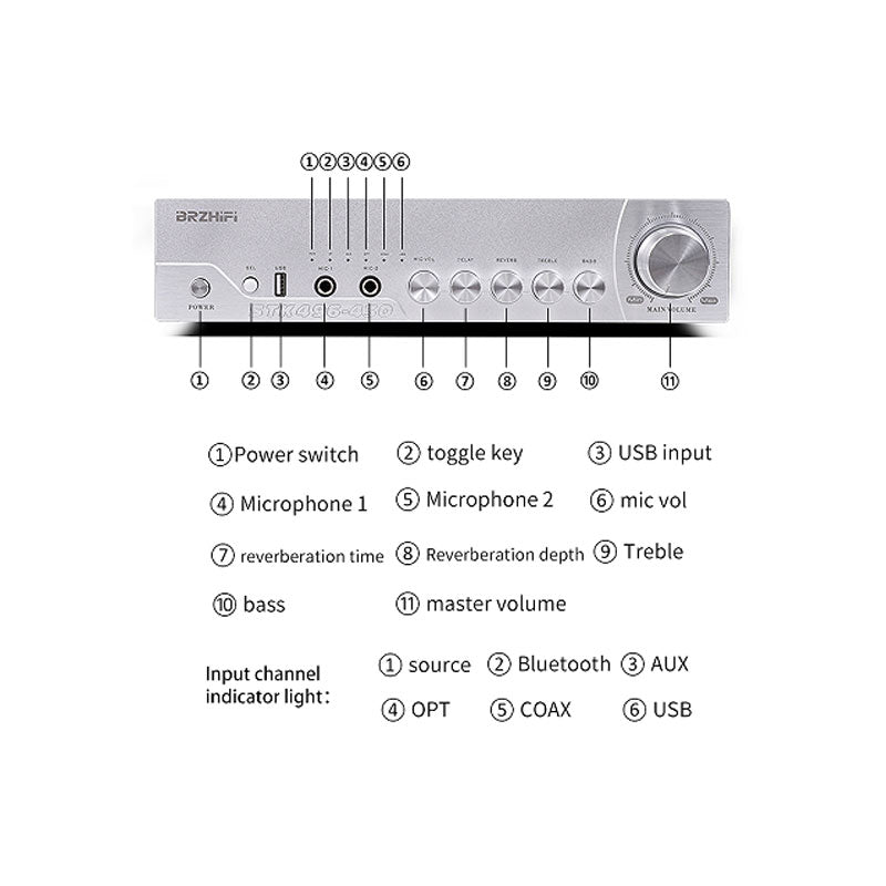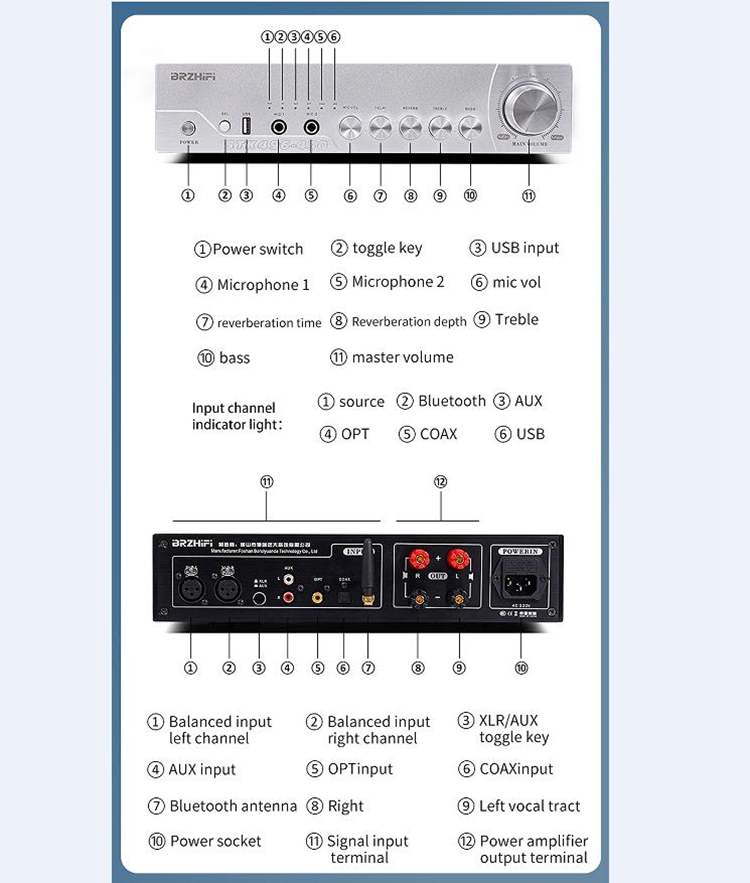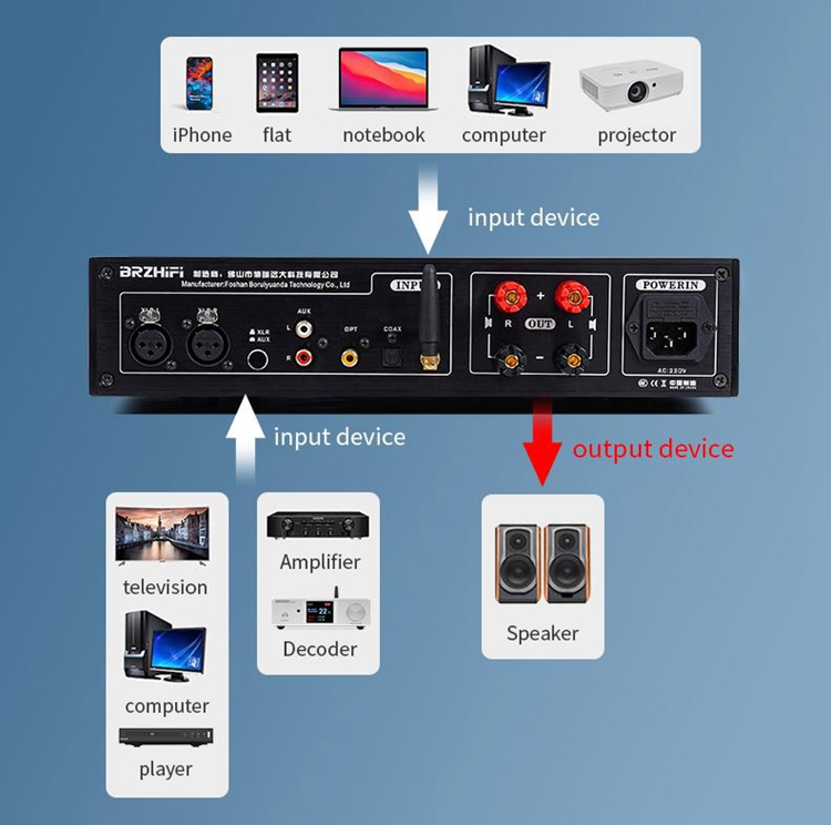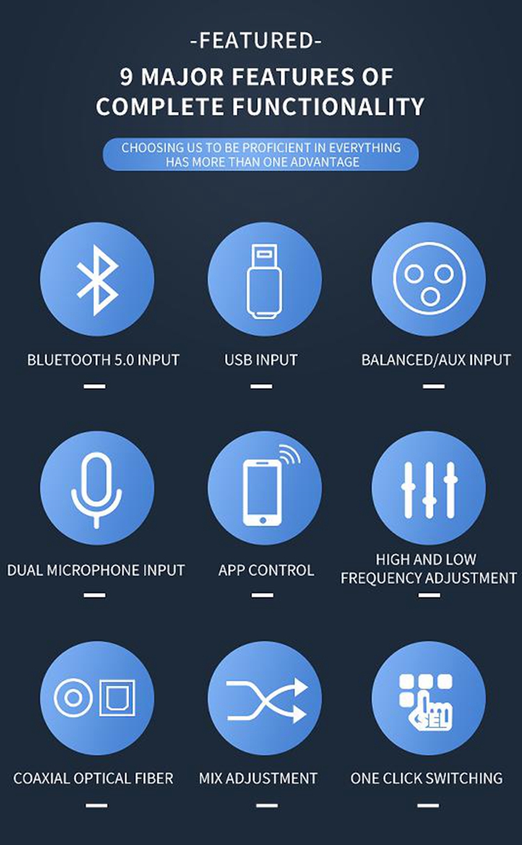 - Audio input: Bluetooth, optical fiber, coaxial, AUX, balanced, USB flash drive