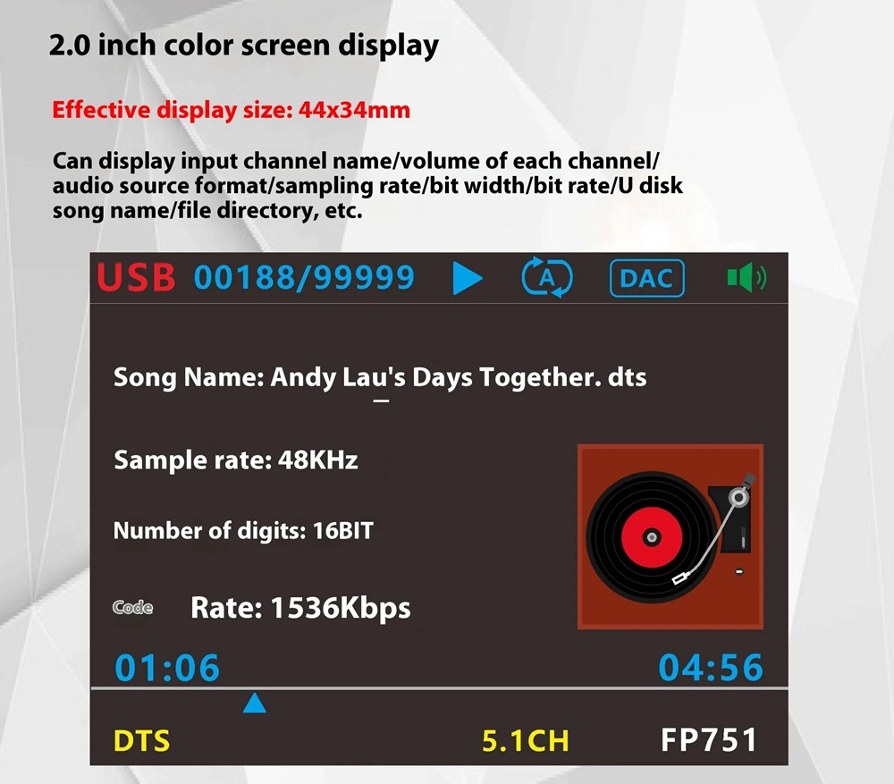 - 2.0-inch color screen display, effective display size: 44x34mm, can display input channel name/volume of each channel/audio format/sampling rate/bit width/bit-rate/USB song name/file directory, etc.