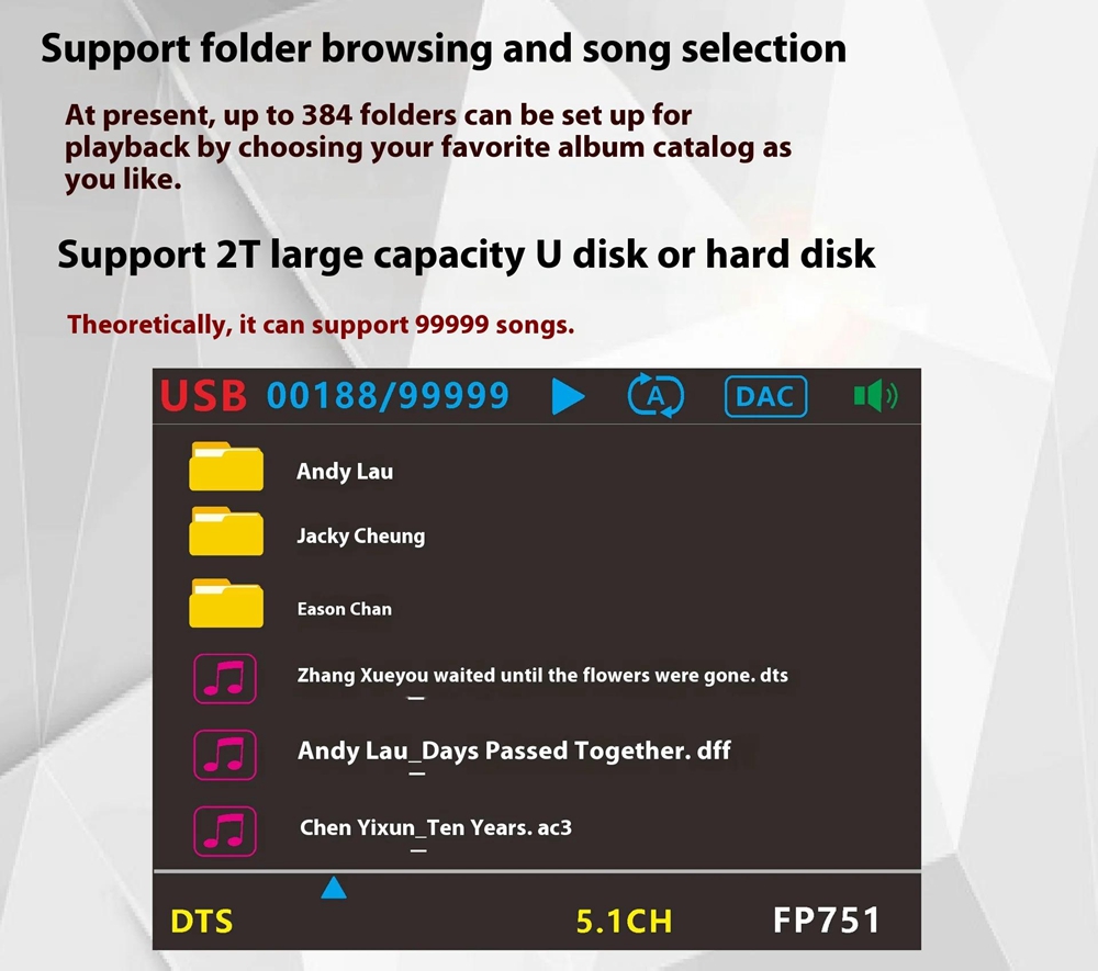 - Support folder browsing and song selection, freely choose your favorite album catalog to play. At present, up to 384 folders can be created, supporting 2T high-capacity USB or hard drives, and theoretically supporting 99999 songs.