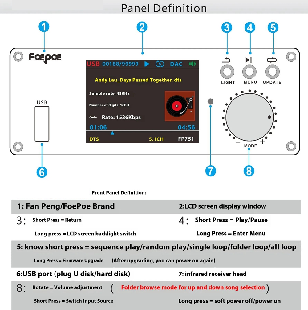 - USB flash drive operation: support previous/next/single loop/folder loop/play/pause, etc.