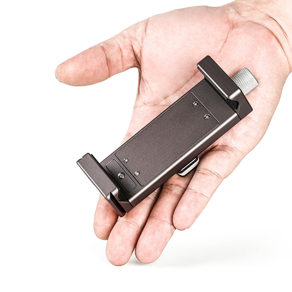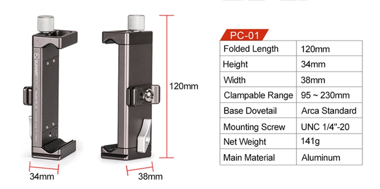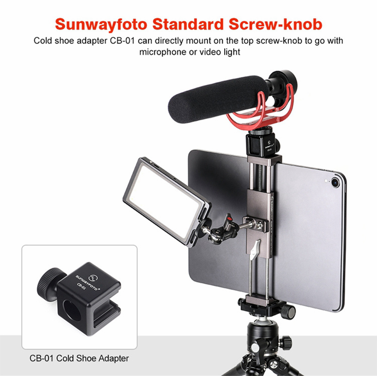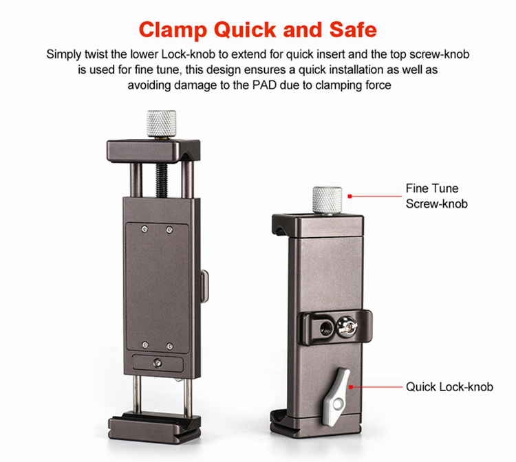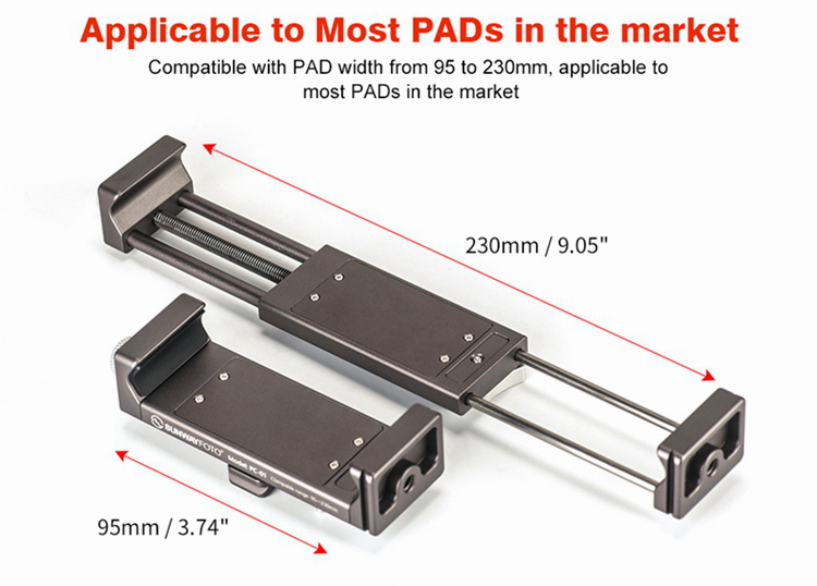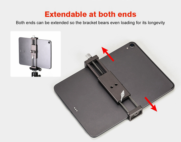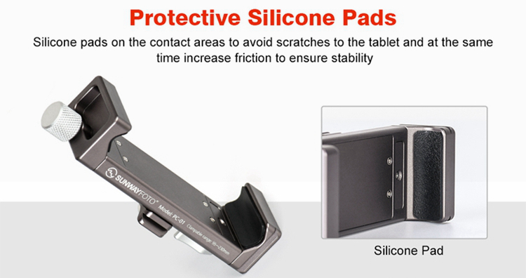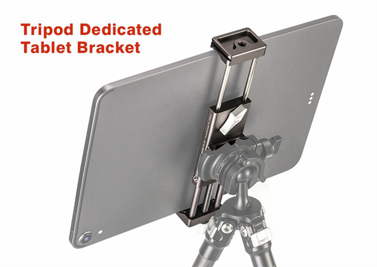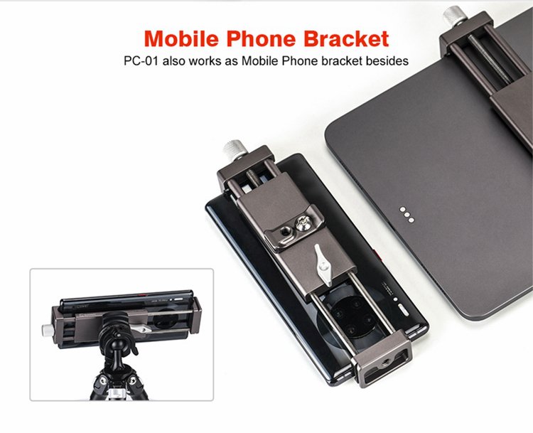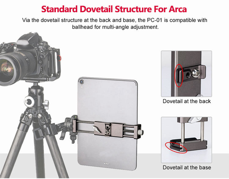 PC-01 tablet computer bracket is dedicatedly deigned for photographers and live video users, mainly made of aluminum, elaborately CNC machined and with Type III hard anodized finish for its resistance to abrasion and corrosion. For PAD width from 95 to 230mm, and standard dovetail for Arca ensures its perfect match with professional tripods to carry out more functions easily. The base 1/4" mounting hole can be mounted on tripod directly.