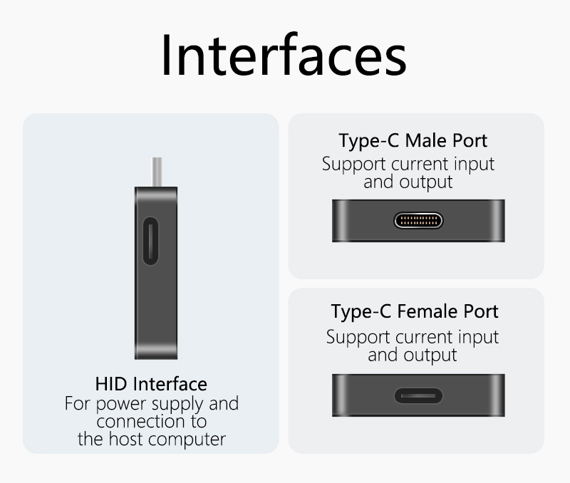 - Independent power supply, computer communication port: Type-C (5V) Name: HID