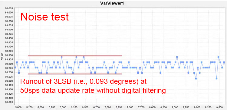 A: Used with a class A sensor, the absolute accuracy is 0.5 degrees (without calibration). The noise peak-to-peak is 0.093 degrees and the resolution is 0.03 degrees when there is the highest update rate and it is not digitally filtered.