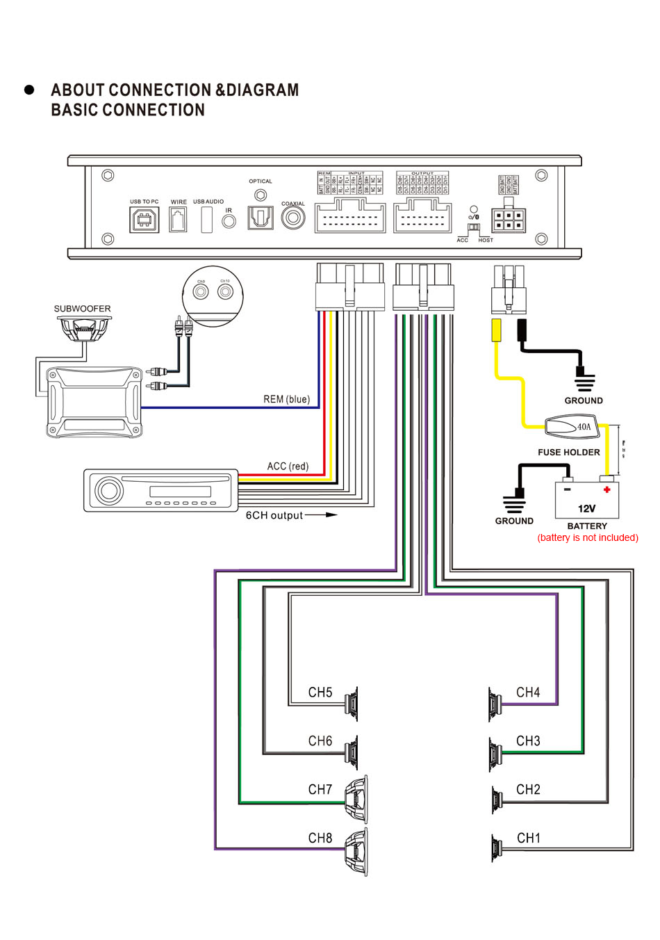 - Input: 6X high level speaker input; Optical SPDIF input; USB input; Coaxial input; Bluetooth input; 2CH RCA (AUX L/R) input