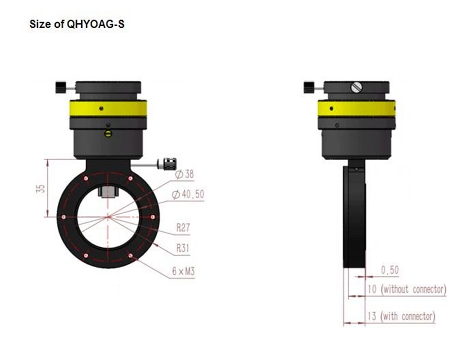 - QHYOAG is a thin and solid design. The OAG main body is just 10mm thick. Adding an M42 thread or M54 adapter ring adds only 3mm for a total thickness of 13mm. There are six 3mm through holes in the OAG for direct connection to the QHYCFW and QHY A Series cameras.