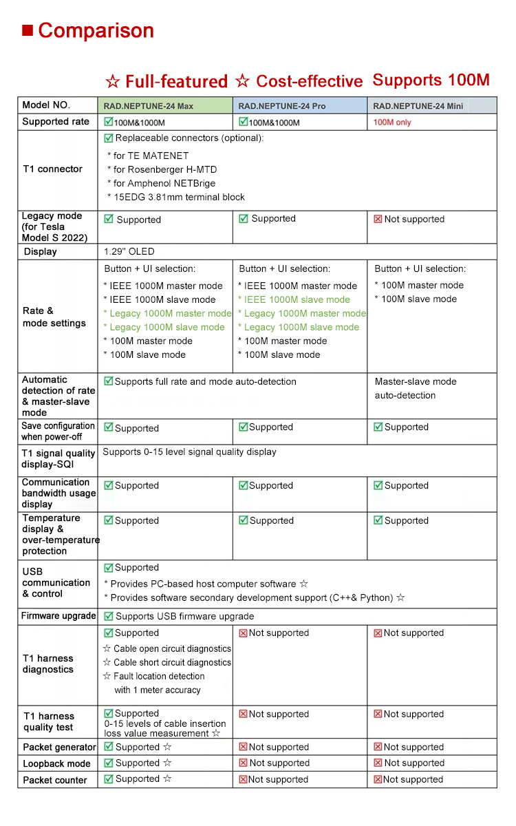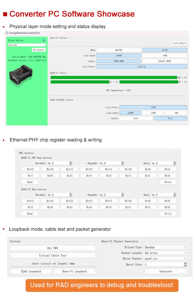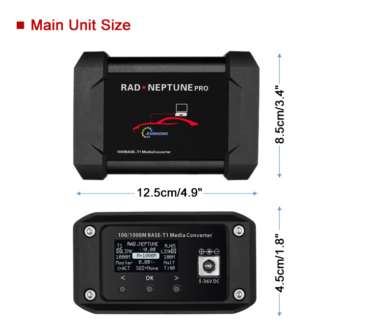 RAD. NEPTUNE is an Ethernet physical layer converter. It can bridge the physical layer between the single-pair twisted-pair vehicle Ethernet and the multi-pair twisted-pair traditional Ethernet. Its low cost, compact size, and high performance make it ideal for monitoring, analysis, diagnostics, and other applications in automotive Ethernet environments.