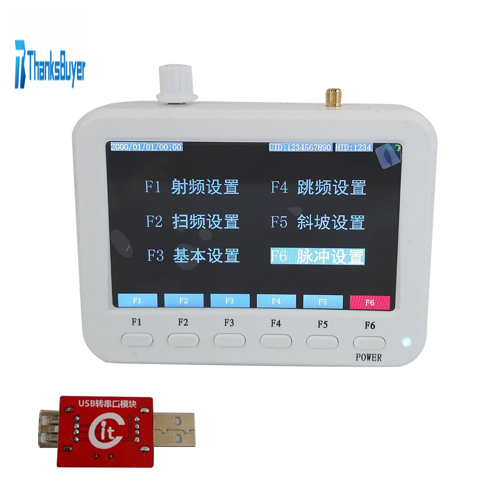 - Frequency hopping output: 100ms / 1s / 10s interval, adjustable start frequency, stop frequency, and transmit power
