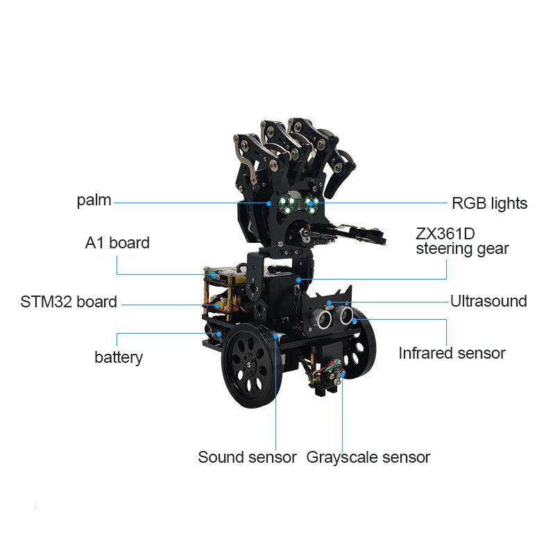 The Gihand2 programming robot has finger sensing and posture sensing functions. It can control the front, rear, left, and right of the car. Equipped with MP3, infrared, sound, sensors, grayscale, loop, and RGB color light modules, it can realize voice broadcast, infrared automatic presentation, voice control rock-paper-scissors, ranging, smart loop, etc. ways to play.