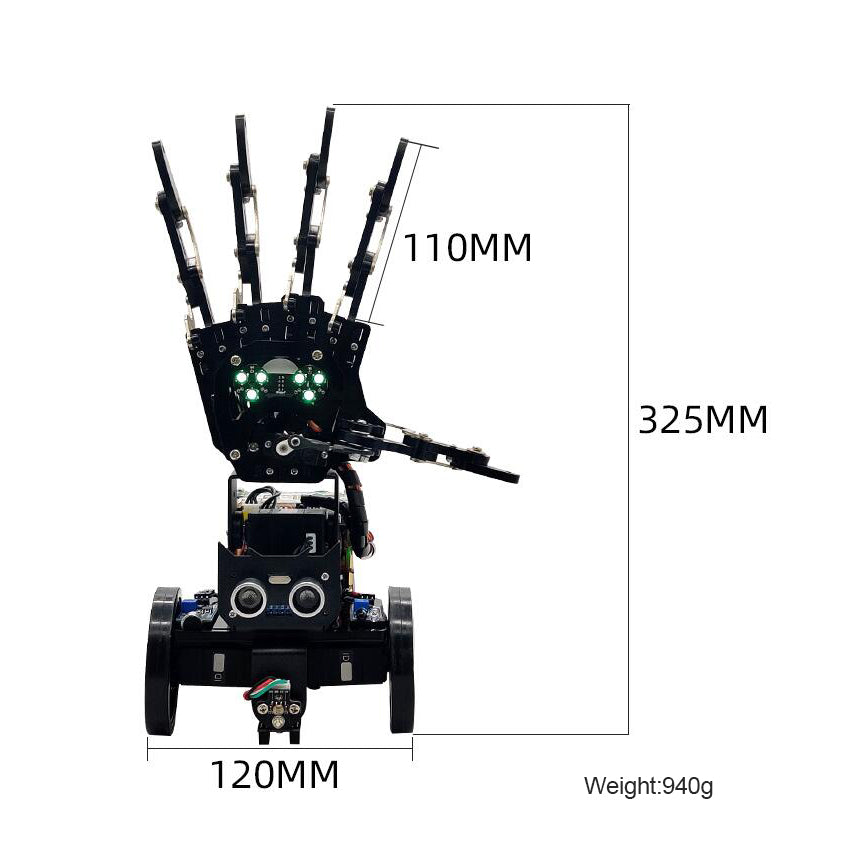 The Gihand2 programming robot has finger sensing and posture sensing functions. It can control the front, rear, left, and right of the car. Equipped with MP3, infrared, sound, sensors, grayscale, loop, and RGB color light modules, it can realize voice broadcast, infrared automatic presentation, voice control rock-paper-scissors, ranging, smart loop, etc. ways to play.