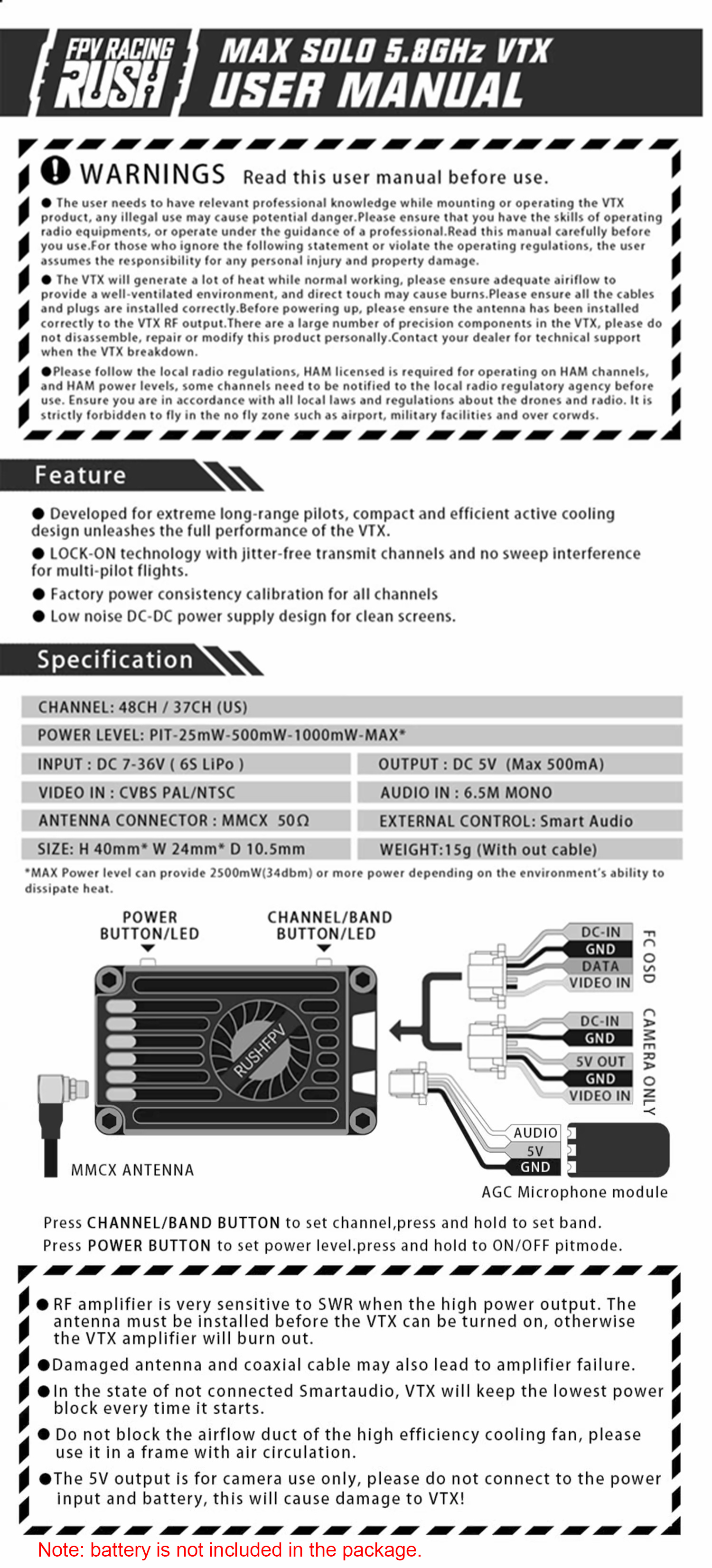 RUSHFPV MAX SOLO 2.5W FPV Transmitter Analog FPV VTX + MMCX Antenna for FPV Fixed Wing Drones