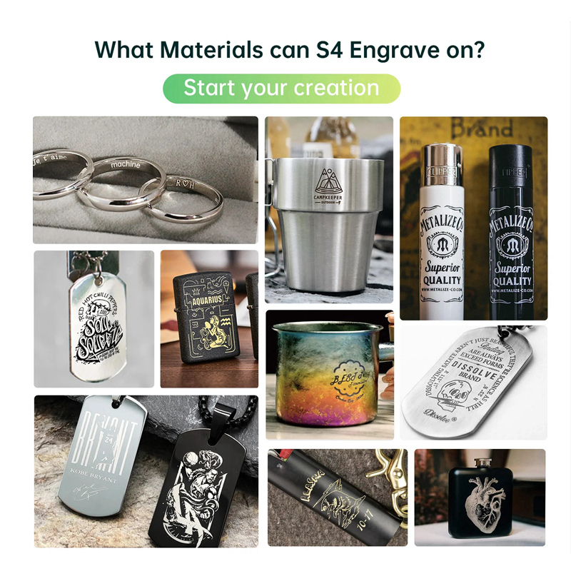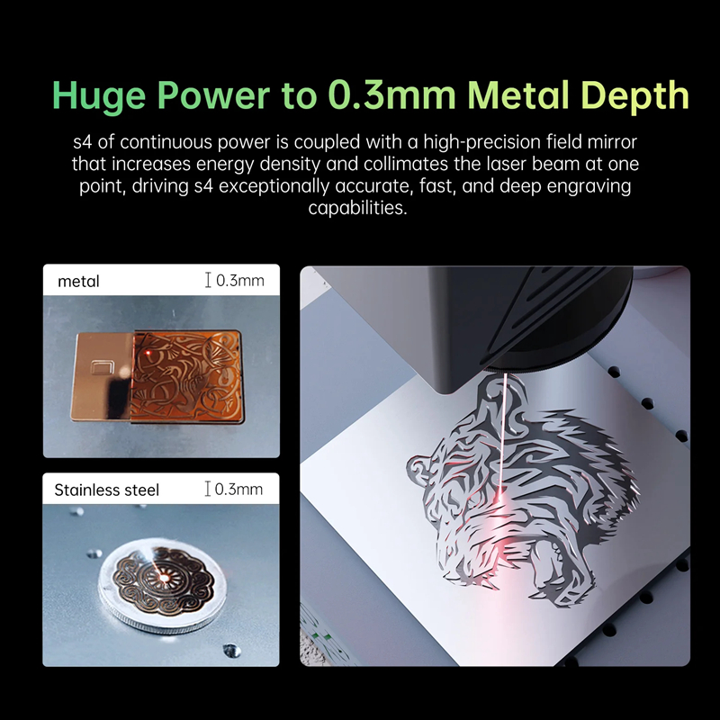 - High Power Output: Digital galvanomenter laser is built for efficient and precise laser marking experience. Equipped with 20W fiber laser, S4 is able to mark on all kinds of metals and plastics with high-quality outcomes.