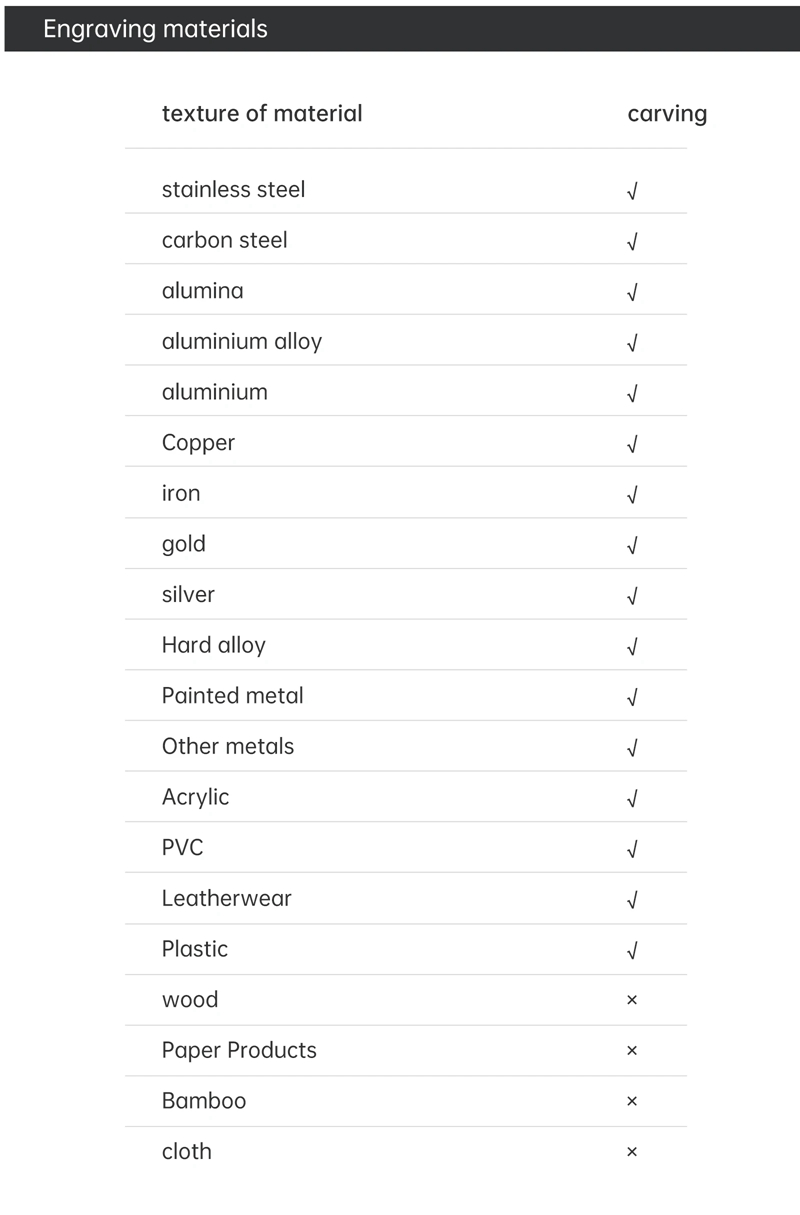 - Carvable Materials: For all metal and non-metal materials, including metal pet brand, metal pendant, stainless steel kettle, plastic button, PVC pipe, plastic shell, acrylic plate, leather wallet and wine jug, metal U disk, electroplated metal and stainless steel.