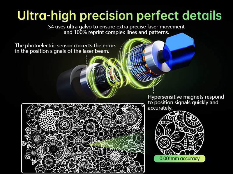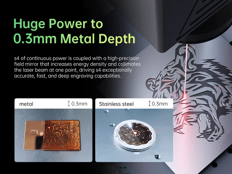 - High Power Output: Digital galvanomenter laser is built for efficient and precise laser marking experience. Equipped with 30W fiber laser, S4 is able to mark on all kinds of metals and plastics with high-quality outcomes.