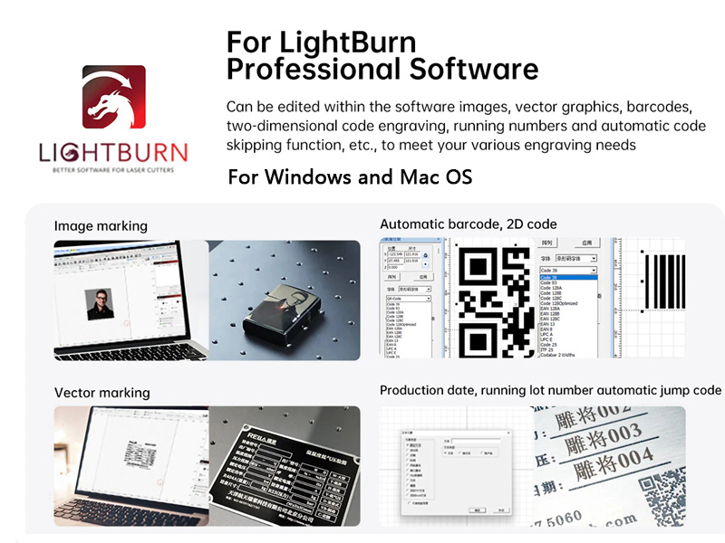 - Operate by Lightburn: S4 adapts Lightburn as operating system, which enables the user to get started quickly and carry out efficient marking operations. At the same time, the machine also has good stability and reliability. It supports for Win7/8/10/11, PLT, BMP, DXF, JPG, TIF, AI, PNG, JPG, etc. Software included with the machine on a USB flash drive (manual and training video).