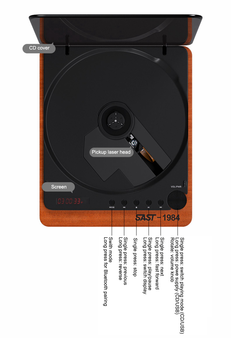 SAST-1984 SA-058 Portable CD Player Retro BT4.2 Bluetooth CD Player (without Remote) for U Disk