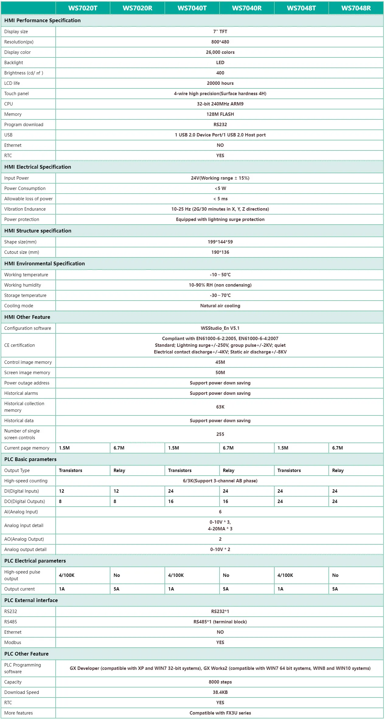 * 7 inches, 12DI 8DO, transistor outputs, 6 analog inputs (0-10V *3, 4-20MA *3) and 2 analog outputs (0-10V *2), 1 RS232, 1 RS485 (terminal block), and 4 high speed pulse output (100KHz)