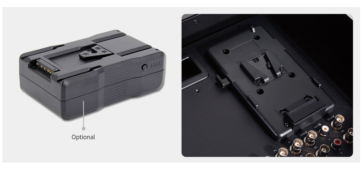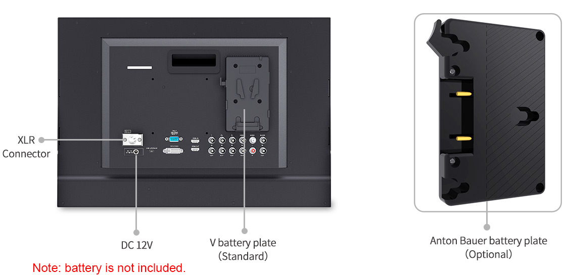 We've made it easy to power the monitor. It can be powered in two ways: with an DC adapter or lithium batteries. The monitor has a flexible battery system that supports V battery plate (standard), Anton Bauer battery plate of your choice.