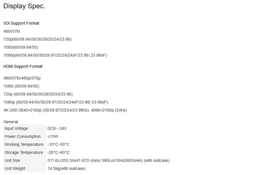 It is an incredibly high quality monitor that's versatile enough to be used from the broadcast facility, mobile live production or on set for feature film production! The monitor comes with 3G/HD/SD-SDI, HDMI, YPbPr, Audio, Video, DVI inputs. Multiple input formats to meet all HD, SD, analogue video signal input and display demand Professional functions set.