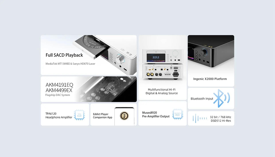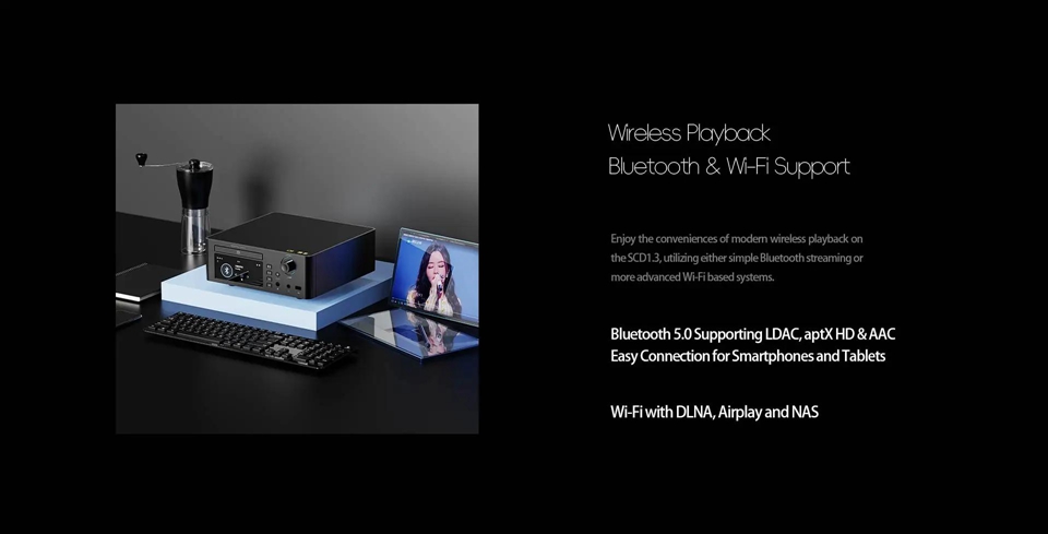 - SCD1.3 shines like a High-End DAC playing SACDs, but it has been designed as a multifunctional source component for a wide range of HiFi settings. In addition to SACDs, you can enjoy playback from local USB drives, convenient Bluetooth streaming or even for DLNA, Airplay and NAS support. And while its single-ended and balanced outputs will be matching partners for many audiophile amplifiers or active speakers, the included digital inputs can power even better DACs, taking advantage of the new I2S advanced support.