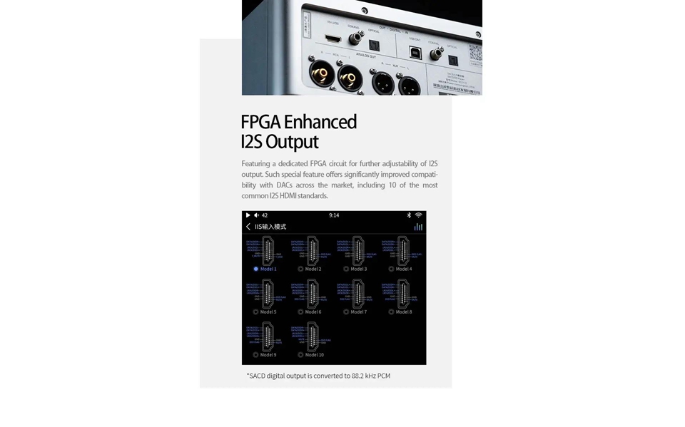 - When it comes to digital outputs, the SCD1.3 adapts a new advanced I2S system, featuring a dedicated circuit for FPGA for further adjustment of I2S output. This special feature offers significantly improved compatibility with DACs across the market, in the launch already including 10 of the most common I2s HDMI-compatible pin outs. And for simpler DACs, there is the classic combination of coaxial and optical SPDIF. Note: SACD disc playback will be converted to PCM 88.2kHz for digital outputs.
