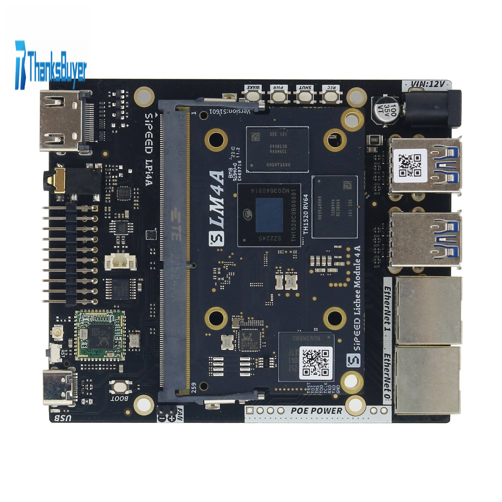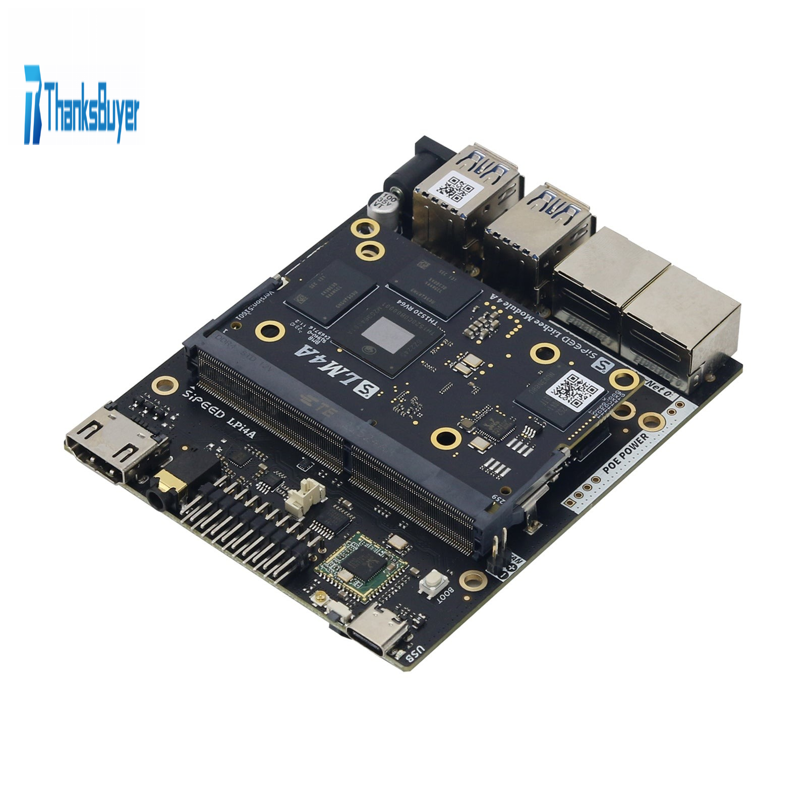 - Lichee Pi 4A is a Risc-V linux development board with TH1520. It contains 4TOPS for int8 Al NPU, supports 16GB LPDDR4X memory and 128G EMMC storage, supports dual 4K resolution screen display, and supports 4K mipi camera input, dual POE Gigabit Ethernet ports and multiple USB interfaces. There is an extra Risc-V C906 Core for audio decode.