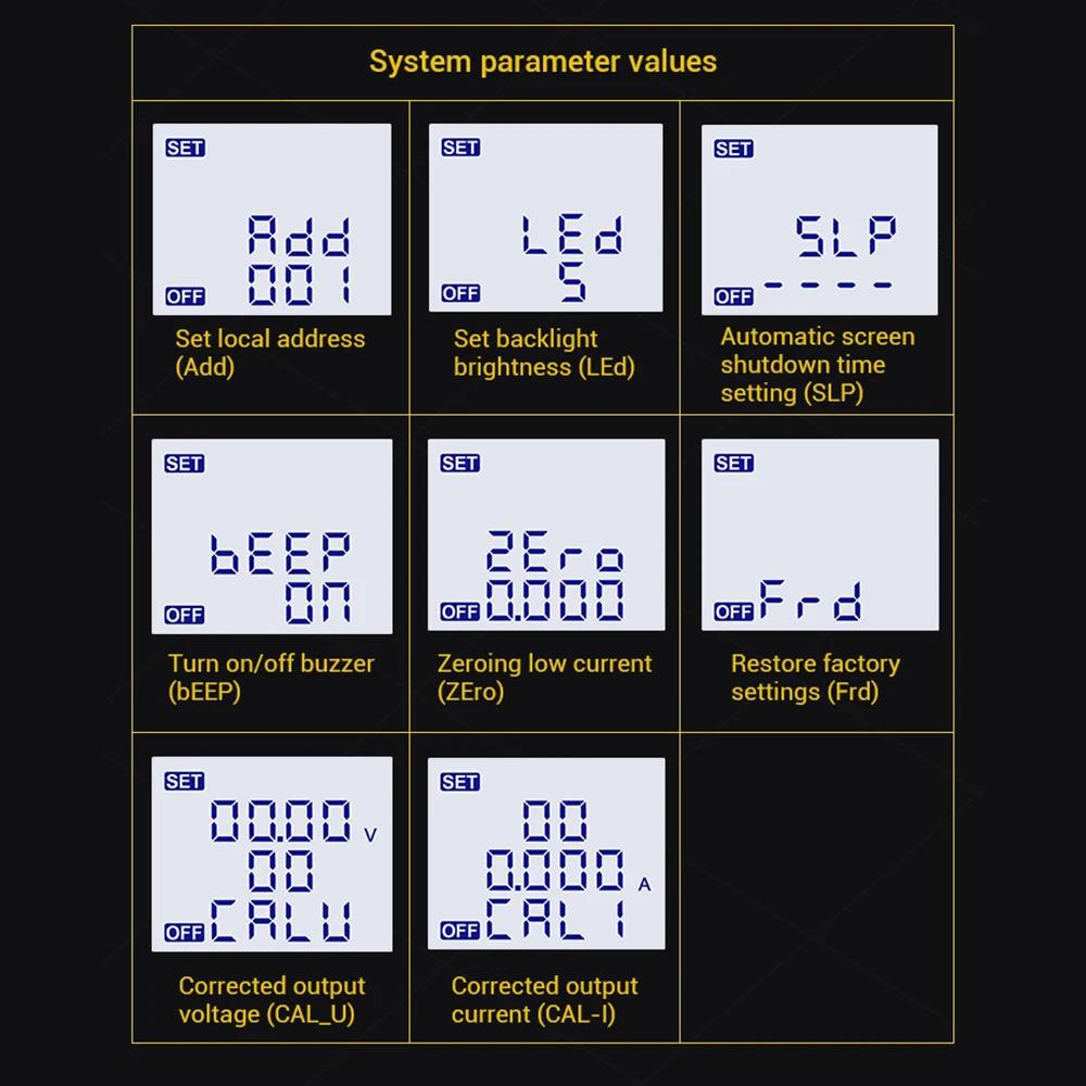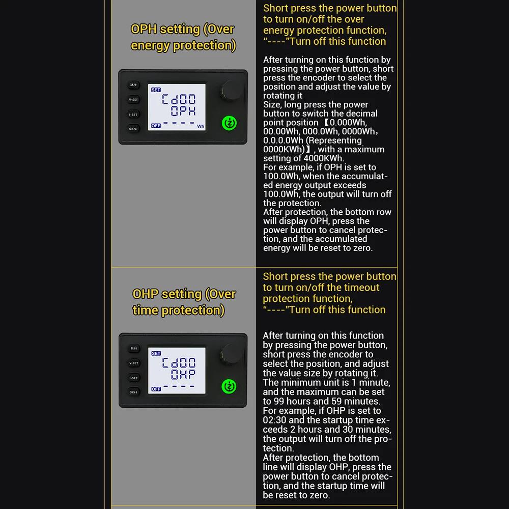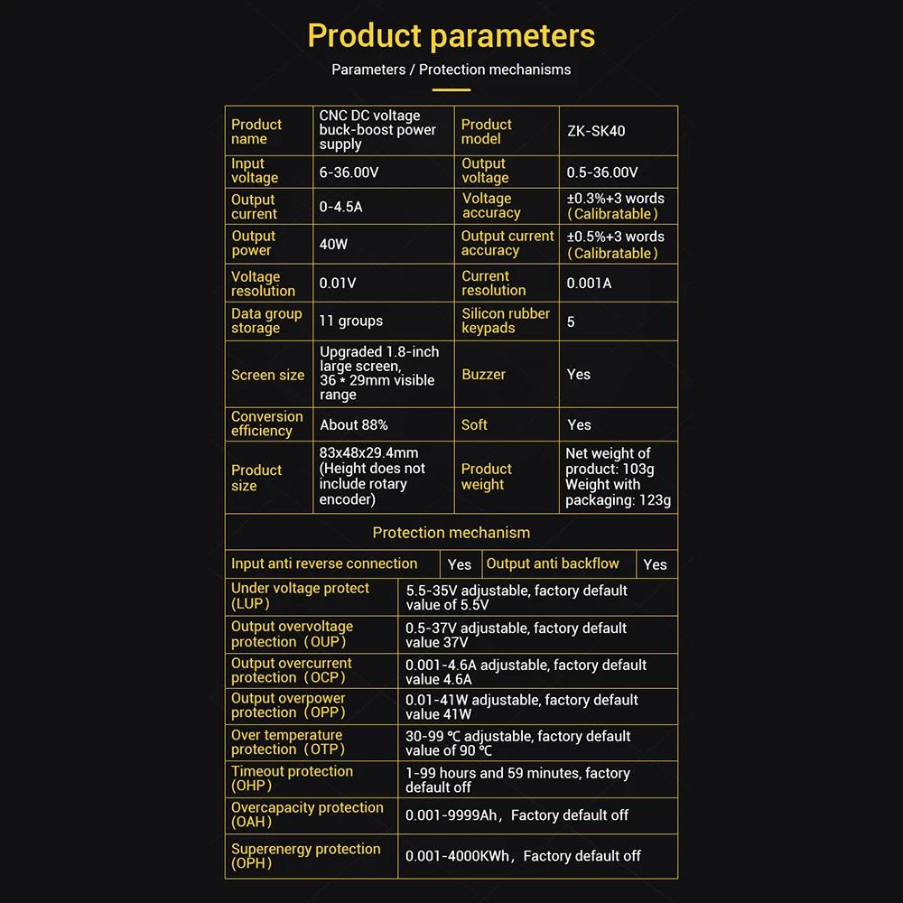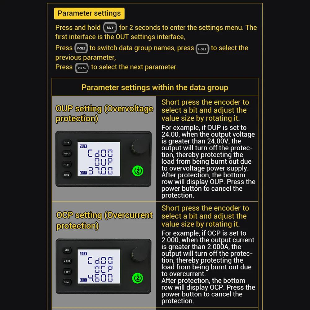 - Output overvoltage protection (OUP): 0.5-37V adjustable, factory default value 37V