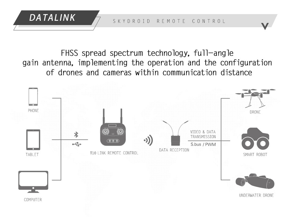 - Dual antenna plus dual RF module with integrated control algorithms ensuring reliable communication via full angle high gain antennas. The T10 uses the latest in FHSS (Frequency Hopping Spread Spectrum) technology to achieve perfect control and operation