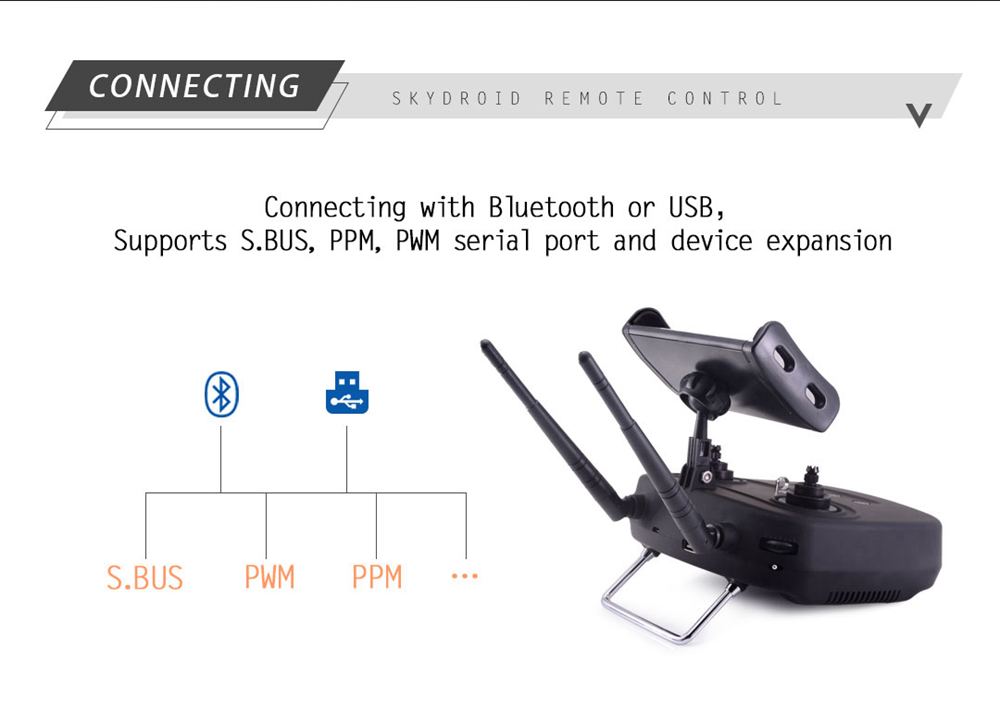 - Connected via Bluetooth or USB, also supports S.BUS, PPM, PWM, Serial ports and external devices, etc