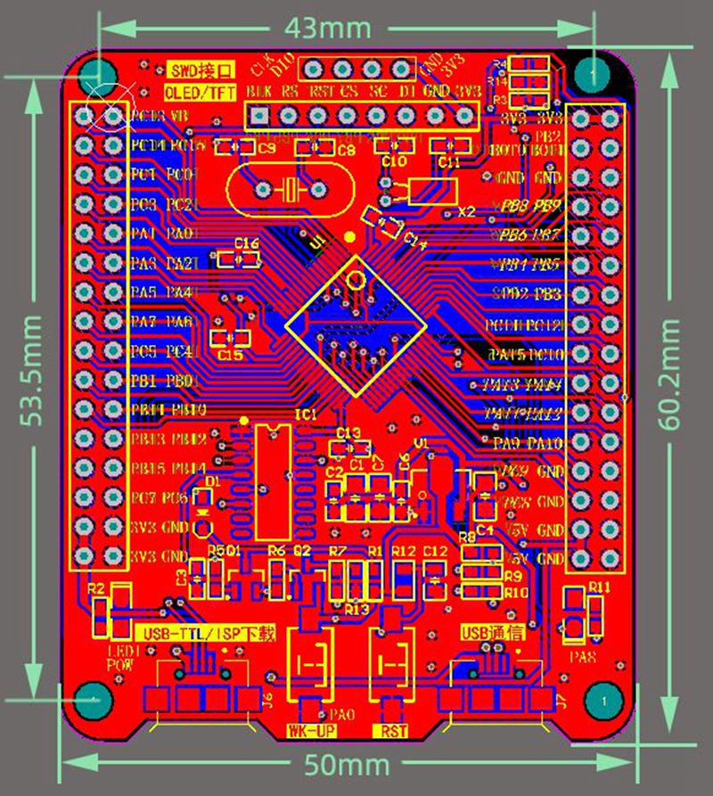 - Lead out two 3.3V and 5V power supplies respectively, and connect either one power supply or USB power cord development board to work. When connected to 5V power supply or USB cable for power supply, the board can output 3.3V power supply externally.