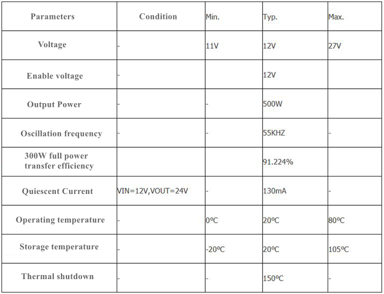 This product is designed for car audio. It can be used in electronic amplifiers. DC12V input, you can adjust the voltage output DC24V, DC30V, DC36V, DC40V, DC48 as needed, and the power output power is up to 500W. Full power output, never falsely marked, you can set the DIP dial to adjust the voltage.