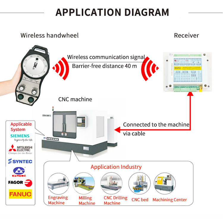 - It is mainly for systems including FANUC, SIEMENS, NUM, LNC, SYNTEC, FAGOR, GSK, MITSUBISHI, etc. The parameters of our handwheel pendant varies to fit for different systems.